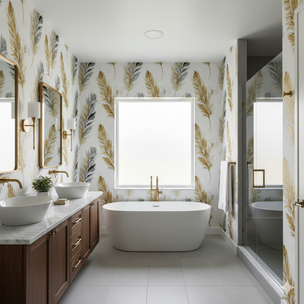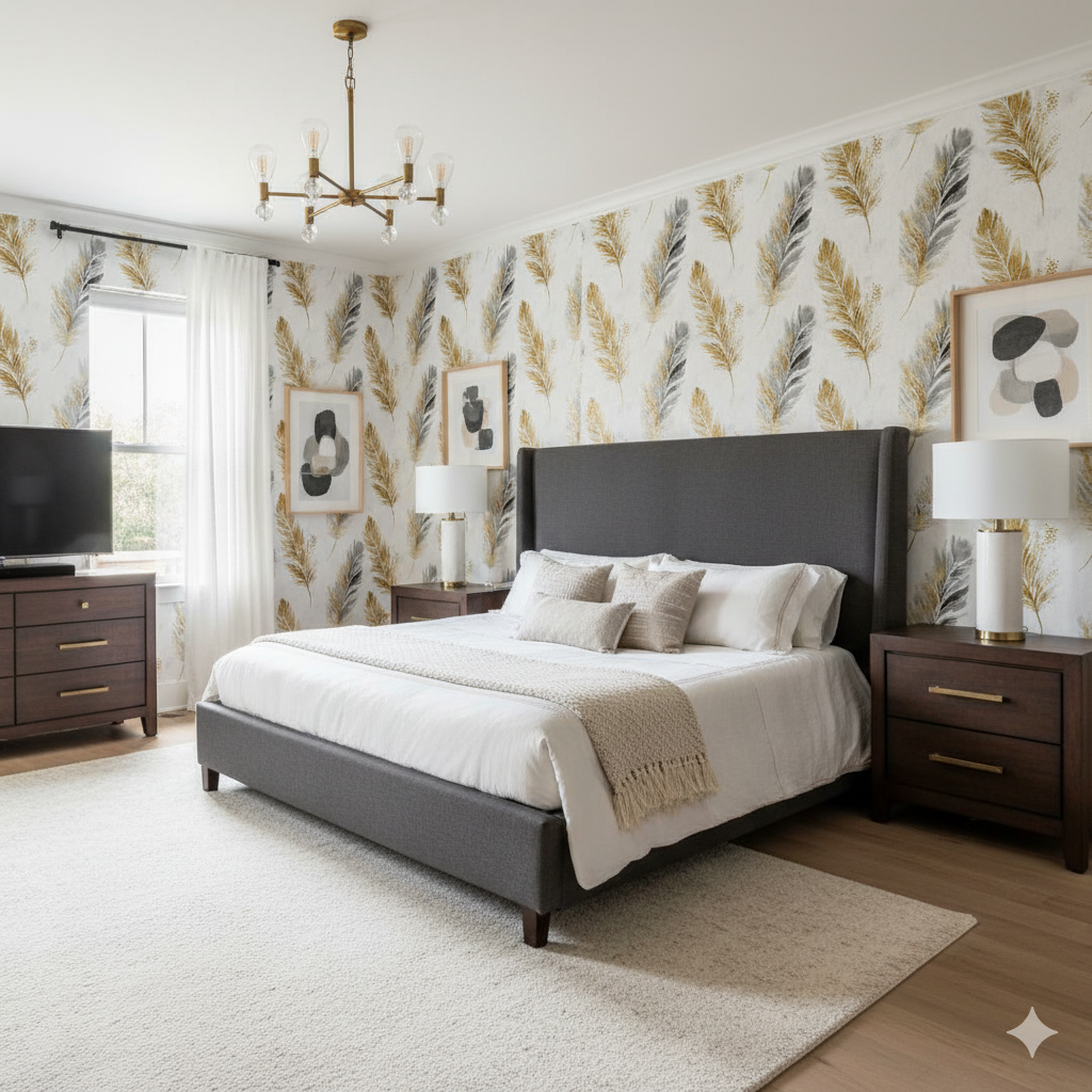 Elegant feathers drift across a soft white canvas, brushed in tones of charcoal grey and gilded with golden tips that shimmer against the subdued ground. The effect is weightless yet luxurious, marrying the ethereal qualities of flight with the richness of metallic detailing. Each feather feels textured and organic, with fine detailing that makes the design appear hand-painted. Perfect for bedrooms, powder rooms, or boutique-inspired interiors, this wallpaper offers a light touch of glamor while maintaining a natural softness. It bridges nature and artistry, balancing delicate imagery with elevated sophistication.
