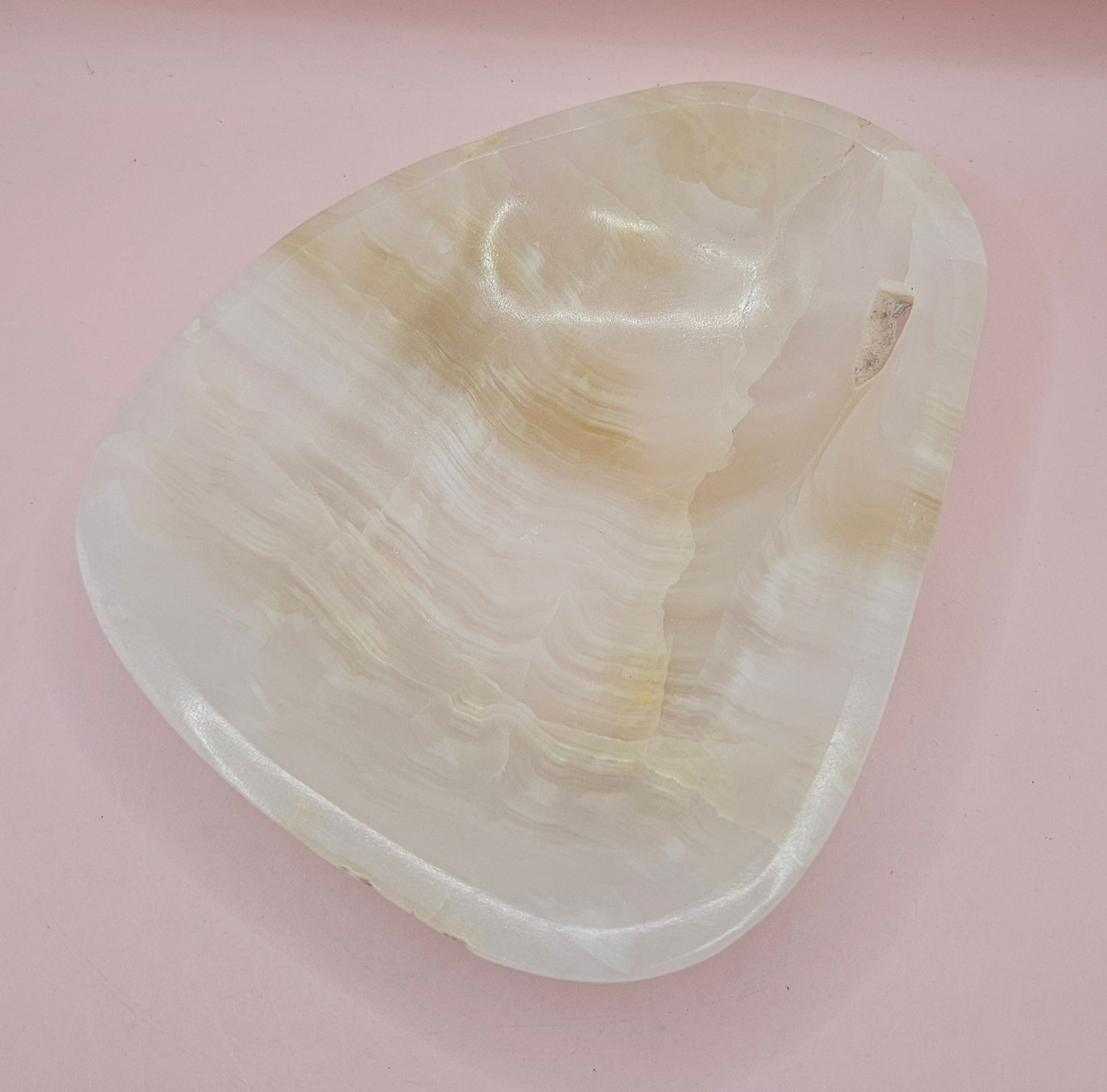 With creamy banded patterns and a glossy finish, this 6.5x5.5" polished onyx dish brings gentle movement and organic elegance to any surface. Its smooth contours and soft ivory-to-golden tones make it ideal for those who love refined natural decor.