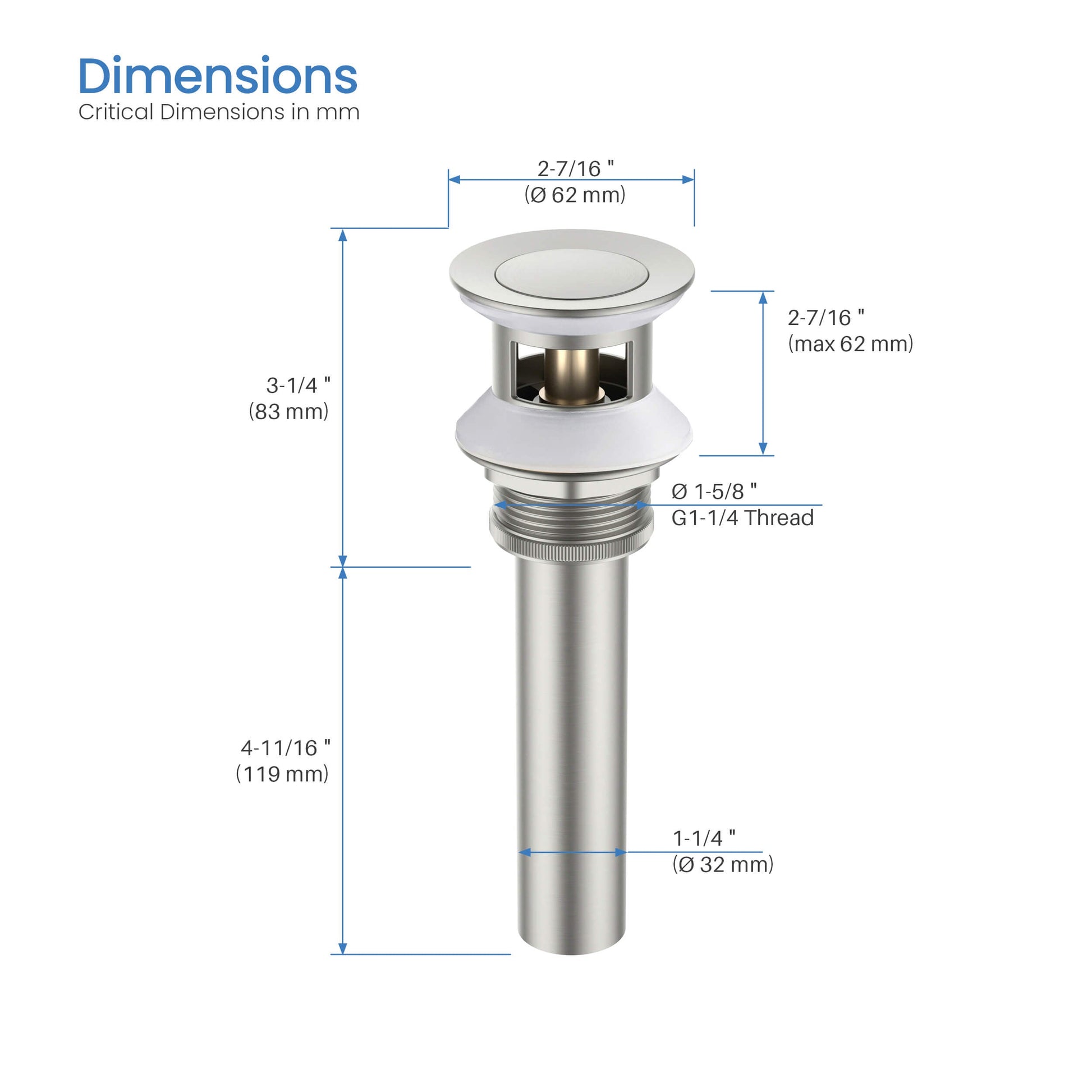 Complete your faucet installation with the Kibi Bathroom Sink Drain with Overflow. This pop-up drain features a brass tailpiece and a 1-1/4" connection.