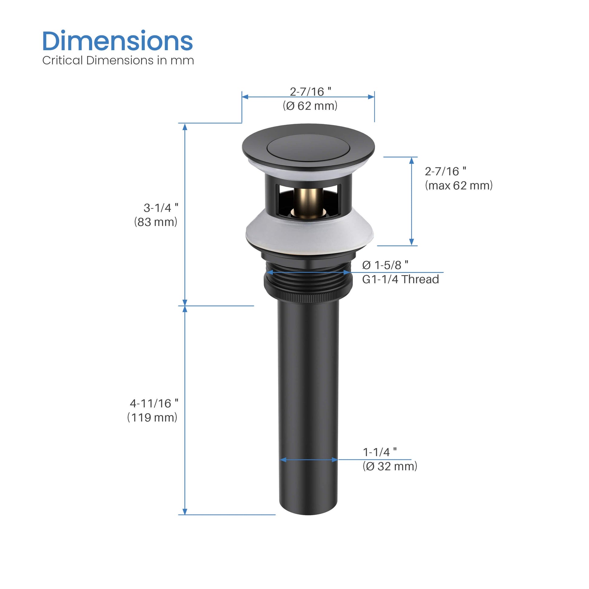 - Standard 1-3/4" drain opening: fits sink hole diameter 1-5/8" to 2-5/16". max sink thickness 2".