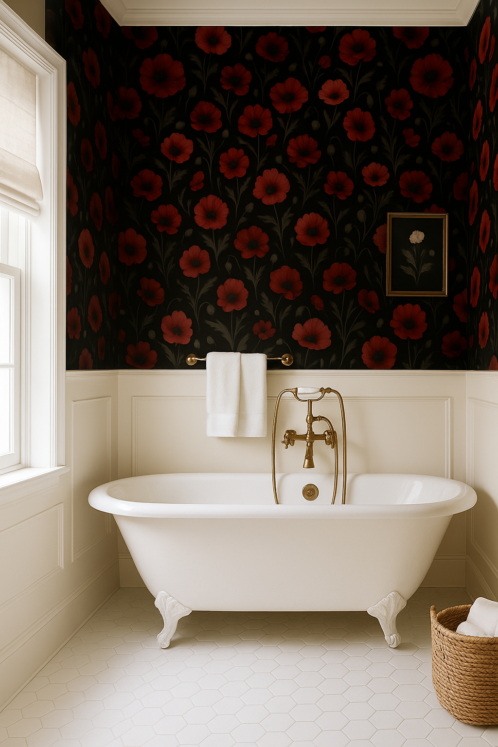 Poppy Fields Wallpaper celebrates the carefree beauty of wild poppies with painterly blooms in vibrant crimson, coral, and blush tones dancing across a soft neutral or sage background. This joyful floral pattern is ideal for bedrooms, living spaces, or bright dining rooms. A top choice for anyone searching for poppy wallpaper, wildflower wall coverings, painterly floral wallpaper, or romantic botanical wallpaper.