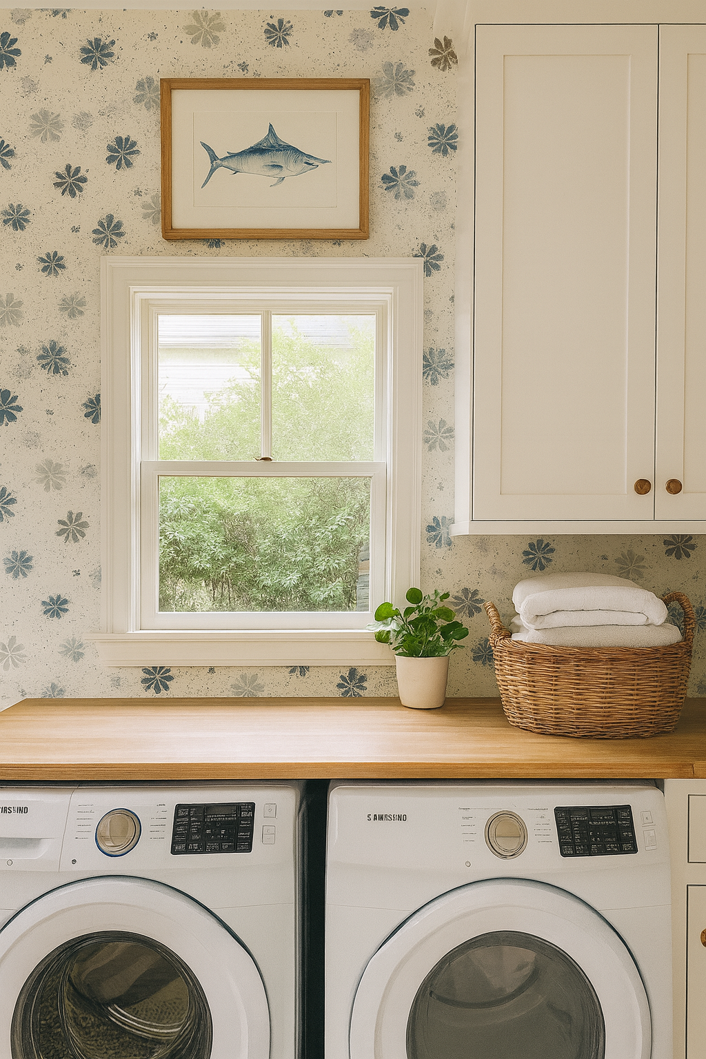 This whimsical wallpaper bursts with hand-stamped floral silhouettes in deep indigo, soft taupe, and misty blue-gray. Scattered across a warm parchment-toned background, the irregular spacing and splatter textures give the pattern a carefree, organic charm—like windblown blossoms across a vintage sketchbook. Ideal for accent walls in creative studios, kids’ spaces, or cozy reading nooks.