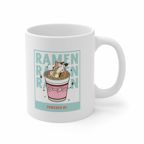 Powered by Ramen Novelty Mug. It’s microwave & dishwasher-safe and made of white, durable ceramic in an 11-ounce size. The perfect gift for the coffee, tea, and chocolate lovers.