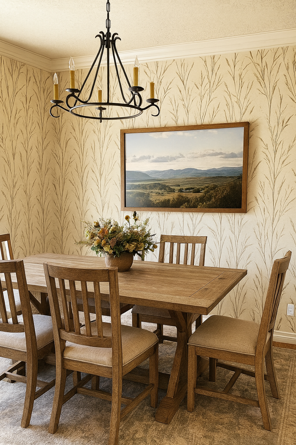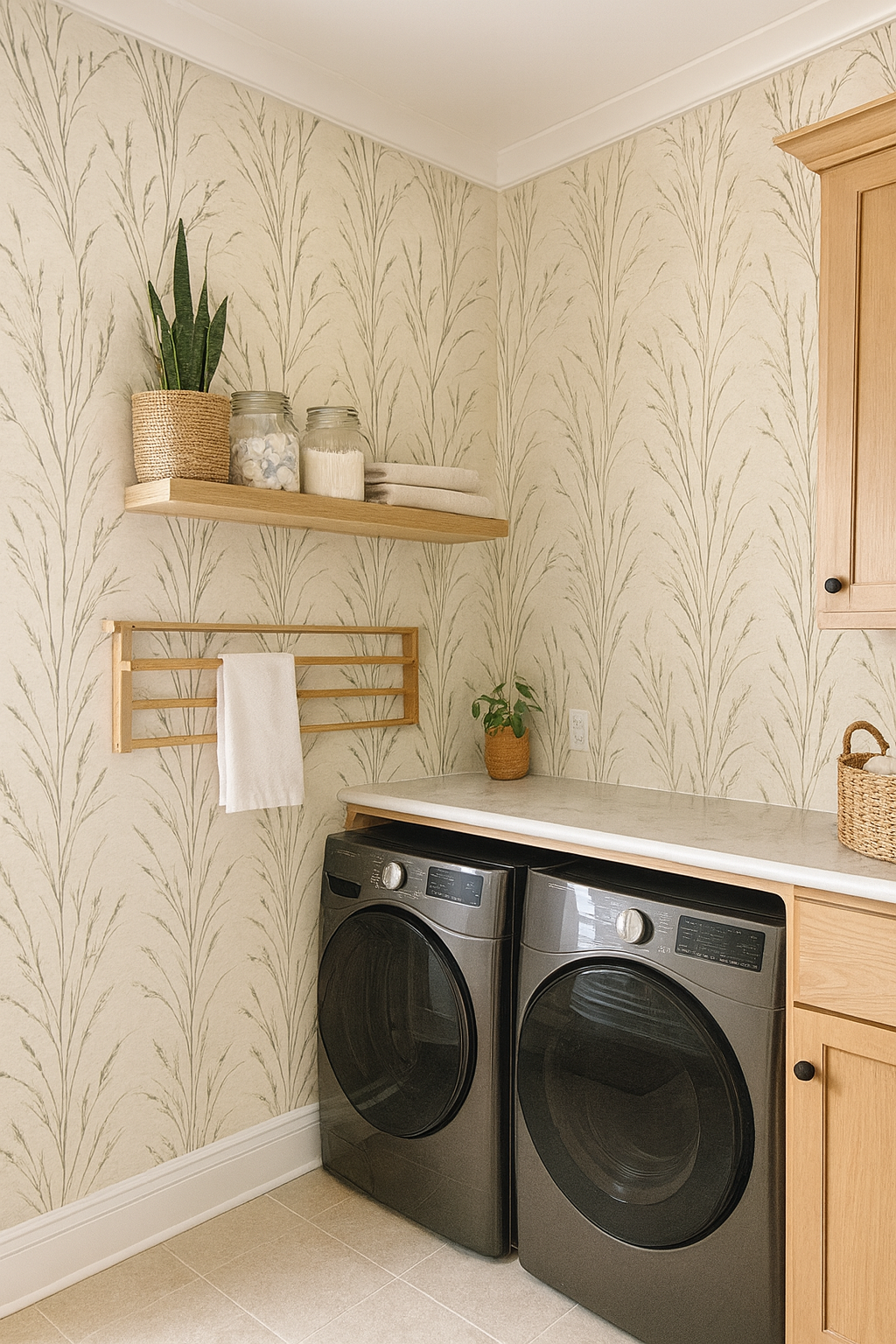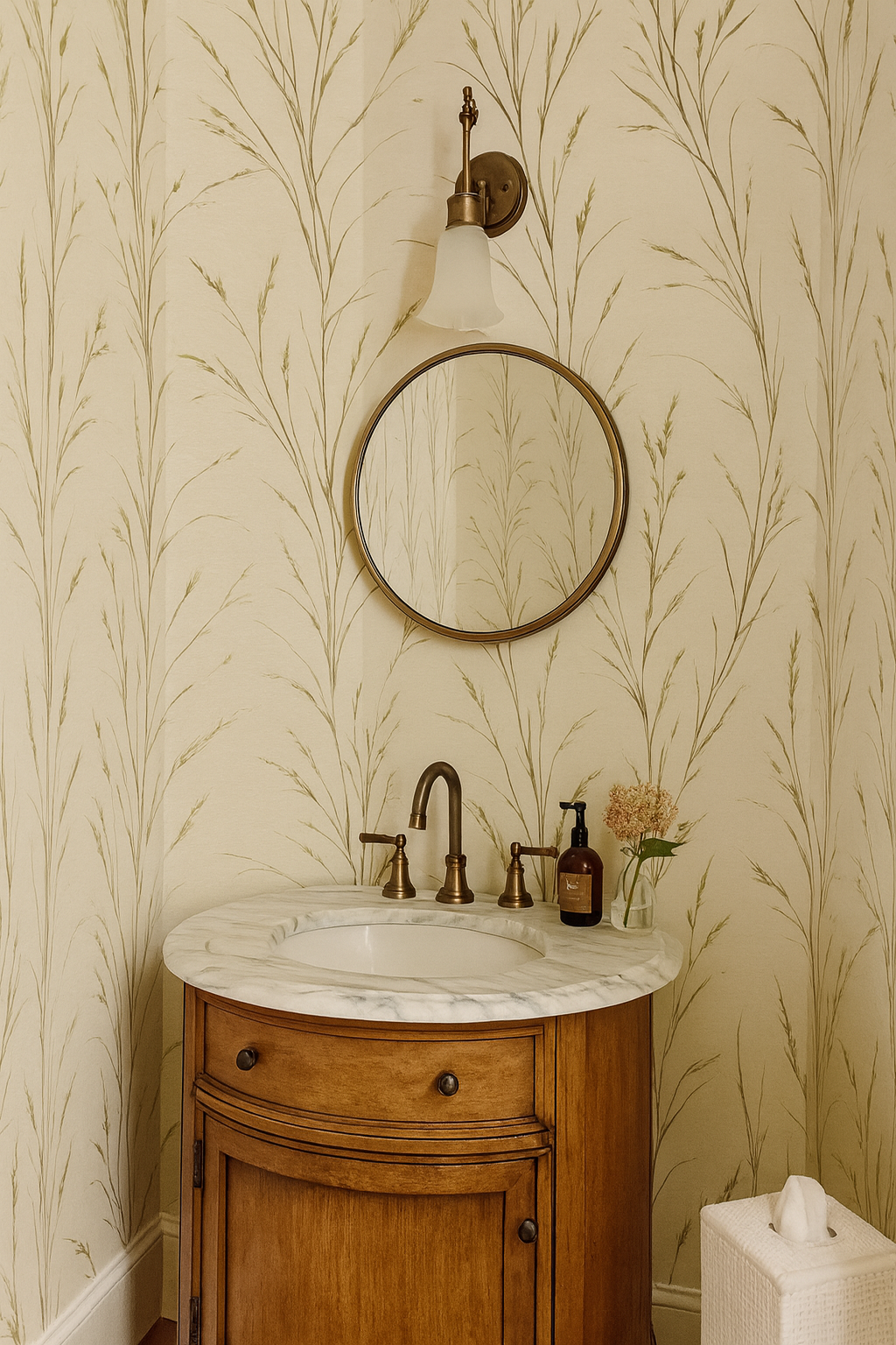 “Prairie Whisper” features graceful stalks of Big Bluestem grass sketched in fine hand-drawn detail. In shades of olive, soft sage, and straw beige, the delicate reeds rise elegantly against a warm parchment background. The linear motion creates a gentle, vertical flow that’s perfect for narrow hallways, spa-inspired bathrooms, or minimalist living rooms. For those who love subtlety and nature’s rhythm, this pattern speaks volumes without shouting.