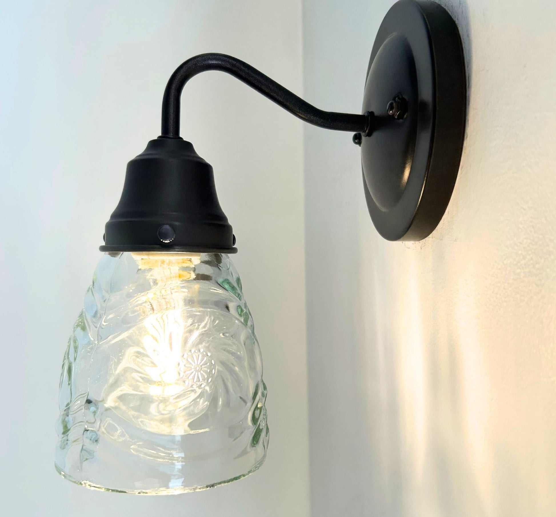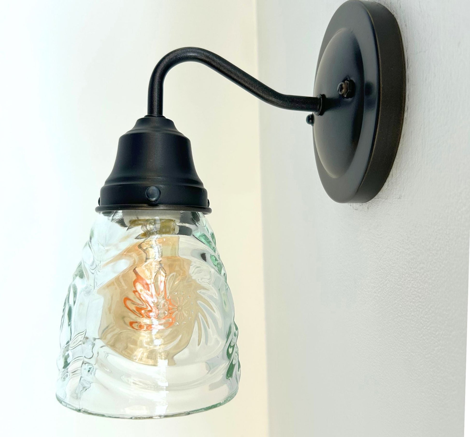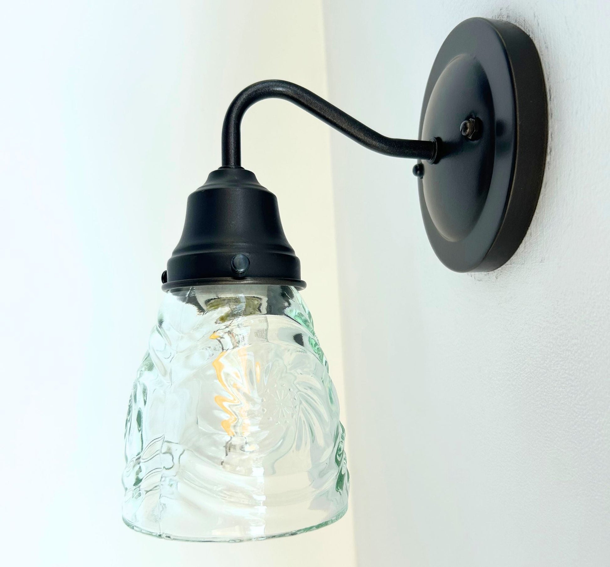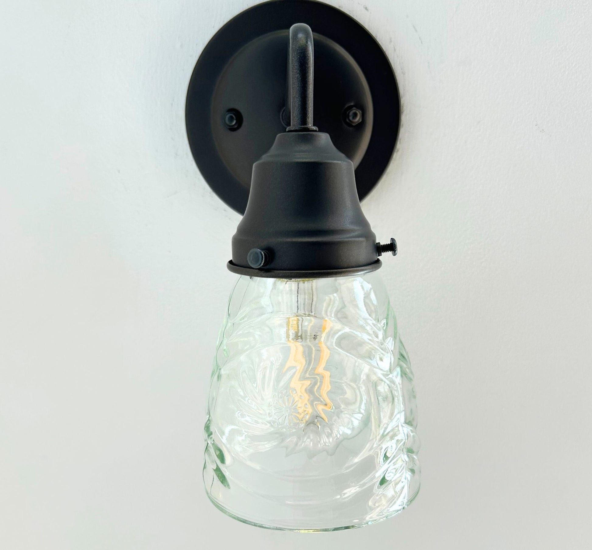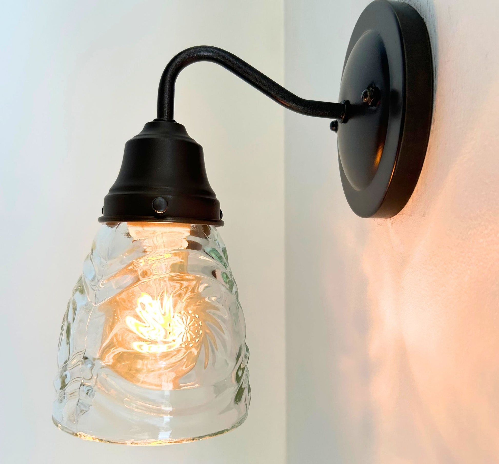 Bring mid-century sparkle to your space with this 1960’s pressed leaded cut glass wall sconce, featuring a dazzling firework pattern that scatters light beautifully across your walls. The intricate starburst design and leaded glass construction make this fixture a striking choice for vintage-inspired interiors, hallways, or bathrooms. Its antique black or rubbed bronze hardware make it perfect for collectors or anyone looking to add retro charm with a functional piece of art. Whether you choose a clear bulb for a bright white illumination or a spiral amber bulb for a warmer tone, this fixture it sure to make a statement in your home!