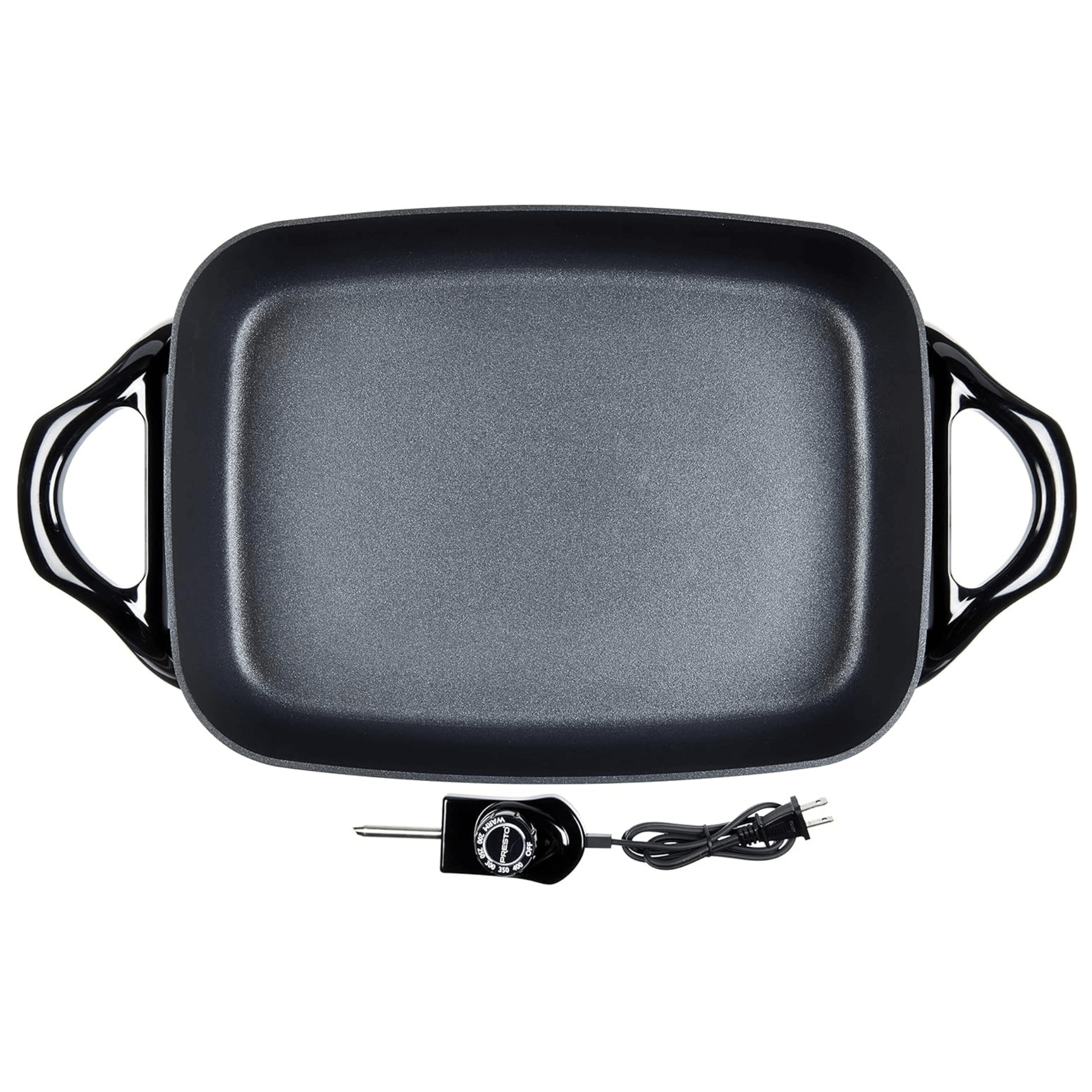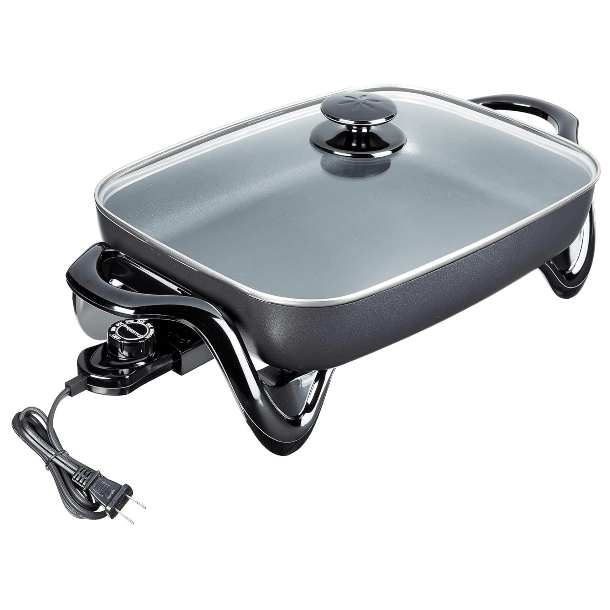You can roast, fry, grill, stew, bake, and make casseroles with ease using this elegant Presto 16" X-Large Electric Skillet. Its spacious 16-inch pan with high sidewalls provides ample cooking and serving capacity, making it ideal for large family meals or entertaining guests. The tempered glass cover, equipped with a stay-cool handle, allows the skillet to serve as a convenient buffet server. The durable ceramic nonstick surface ensures stick-free cooking and easy cleanup. The adjustable Control Master heat control automatically maintains the desired cooking temperature. This skillet is also energy-efficient, using less power than a traditional range burner or oven. Constructed with a heavy cast aluminum base, it is virtually warp-proof. The skillet is fully immersable once the heat control is removed, making it simple to clean.