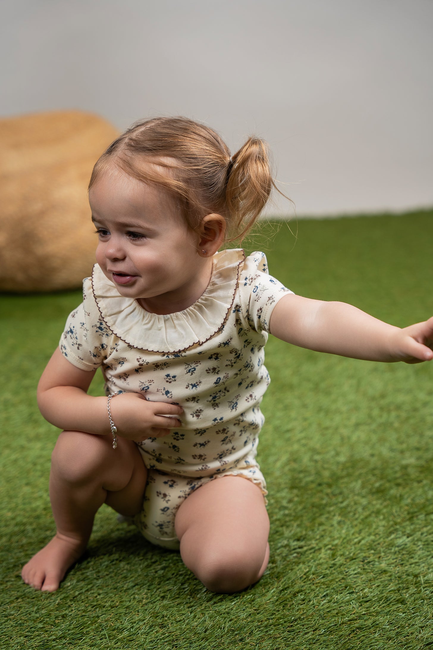 Baby girls soft fine rib allover printed 2 piece set. Short sleeve top with woven ruffle collar and center back button opening. Matching bottom with covered elastic waistband and twill tape at front with ruffle at leg opening. ֲ