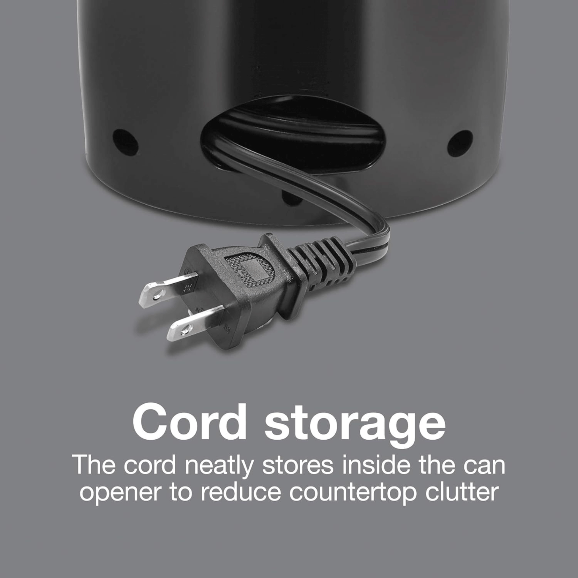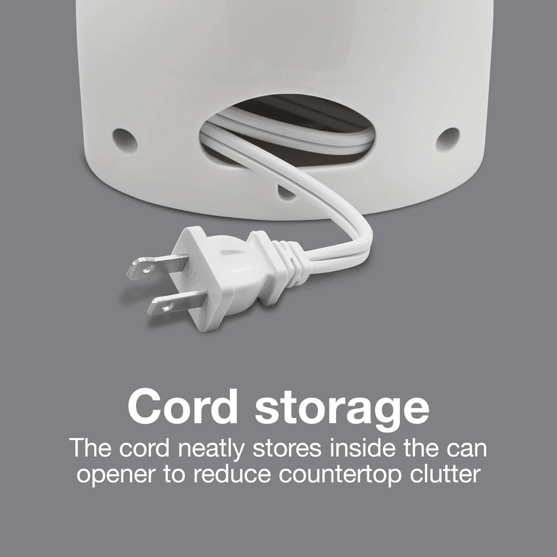 - The cord stores neatly inside the base of the automatic can opener to reduce countertop clutter