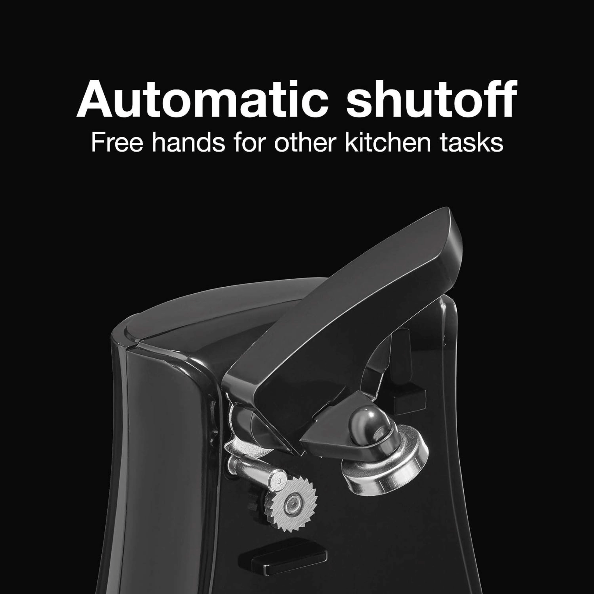 The Proctor Silex Power Opener™ Can Opener is designed for ease of use and cleaning, featuring a washable cutting lever that easily twists off. This can opener comes with several convenient features to simplify your kitchen tasks. It includes a built-in knife sharpener on the back, allowing you to keep your kitchen knives sharp without needing a separate tool. The cord can be neatly stored in a compartment at the base, reducing countertop clutter. The guide post ensures easy alignment, allowing you to open cans on the first try without any hassle. In addition to its user-friendly design, this electric can opener has an auto-shutoff feature, freeing your hands for other tasks. It is versatile enough to open various can sizes, making it a valuable addition to any kitchen.