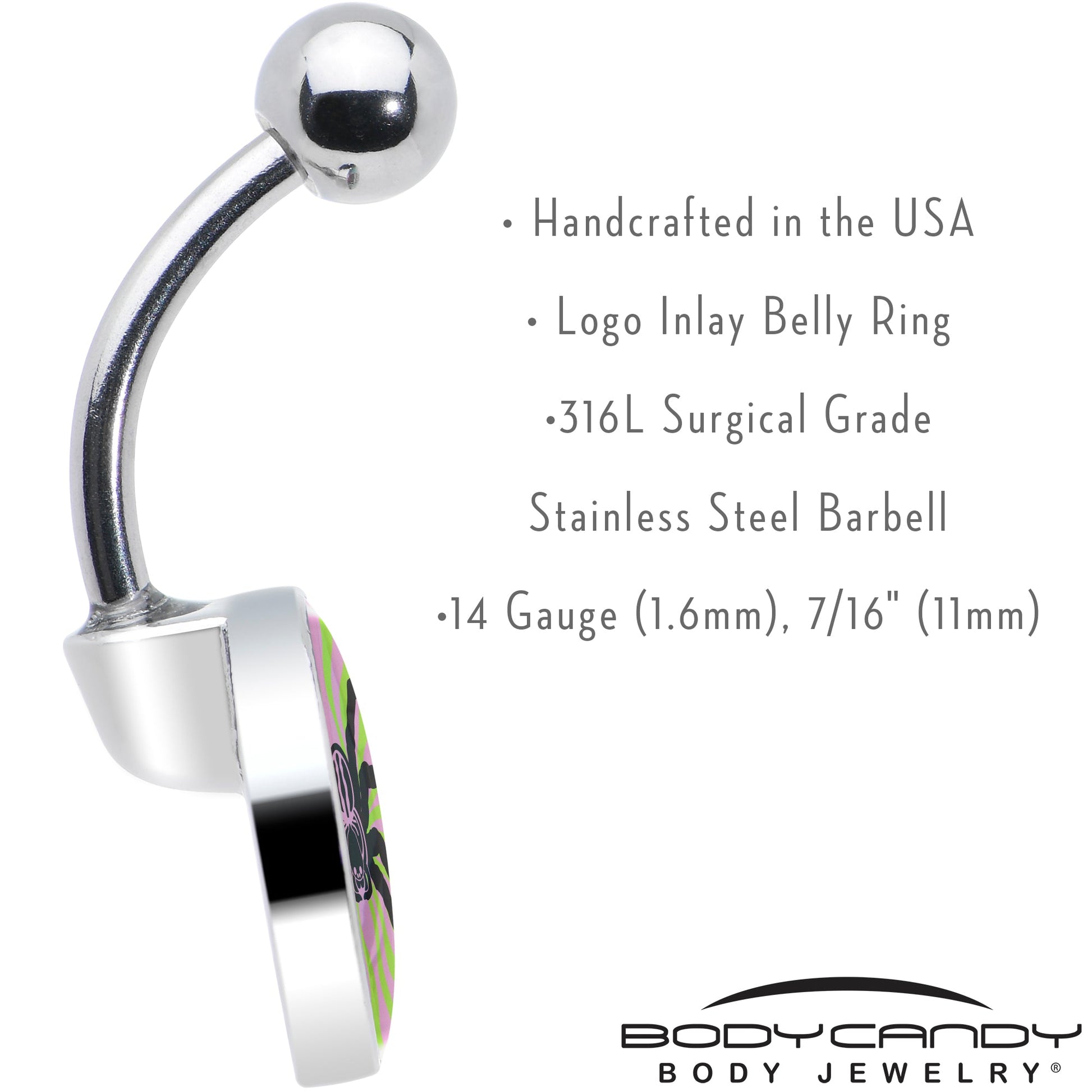 Get caught in a web of style with this 14 gauge stainless steel navel ring. It's made with a 7/16 inch 316L surgical grade stainless steel curved barbell with a 5mm top ball end. The bottom end features a bright green and purple disc logo charm. At the center is a large black spider with matching purple contrast for a gorgeously gothic look you'll love all year round. Even arachnophobes are sure to get stuck on this spider stainless steel belly piercing jewelry. Unique artist-drawn logo inlay design surgical steel belly button ring.