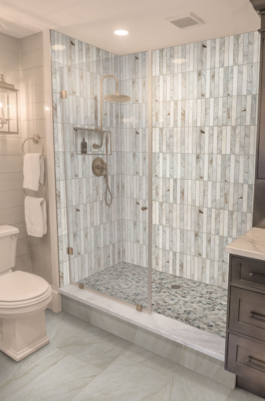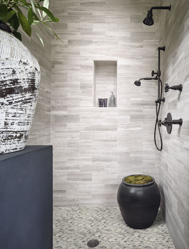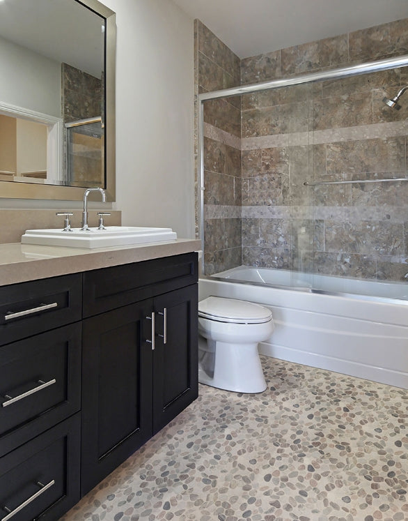 Puebla Greige Pebble is a handsome and elegant mosaic featuring tumbled marble stones that appear like smooth pebbles. In an artistic mix of muted creamy whites, dusty grays, and barely beiges, this marble pebble backsplash gives your project a signature look without sacrificing durability. Use it on hardworking surfaces like mudroom or shower floors, or install it as a shower surround, fireplace facade, or backsplash. This tile is Greenguard Indoor Air Quality Certified® and comes mounted on mesh-backed sheets for simplified installation and a professional finish. It also pairs well with other glass mosaics, wall tile, and floor tile.