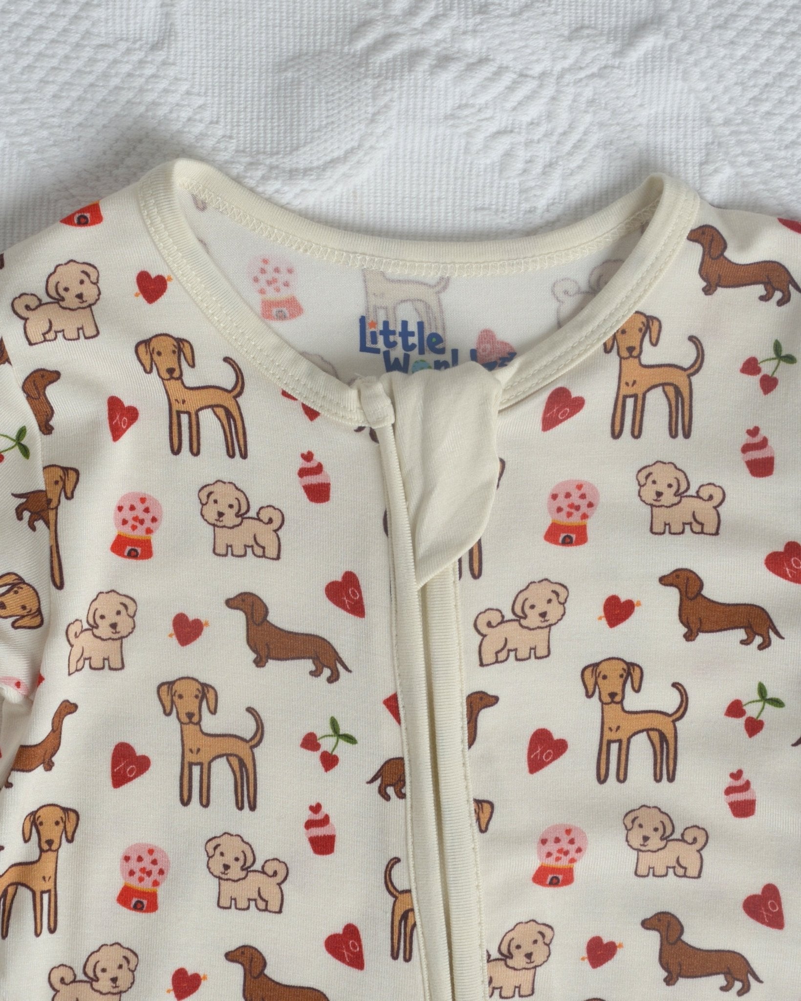 Get ready to "paw-ty" with the I Ruff You Bamboo Onesie! This adorable footie features a double zipper for easy diaper changes, grippy soles for first steps, and a playful print with cute pups. Made with soft, bamboo fabric, it's breathable, and perfect for snuggles.