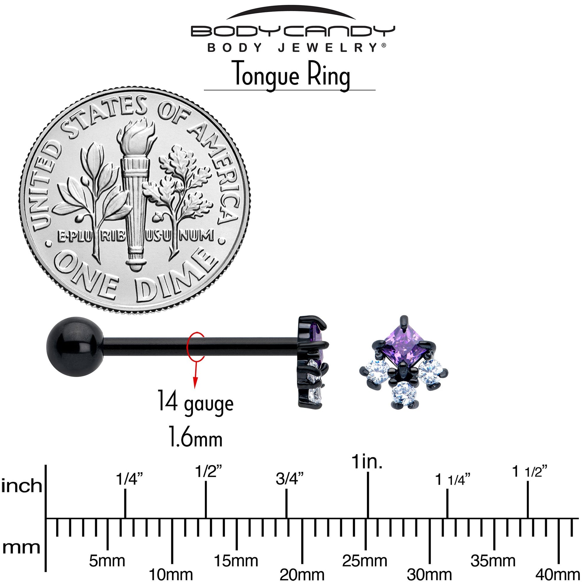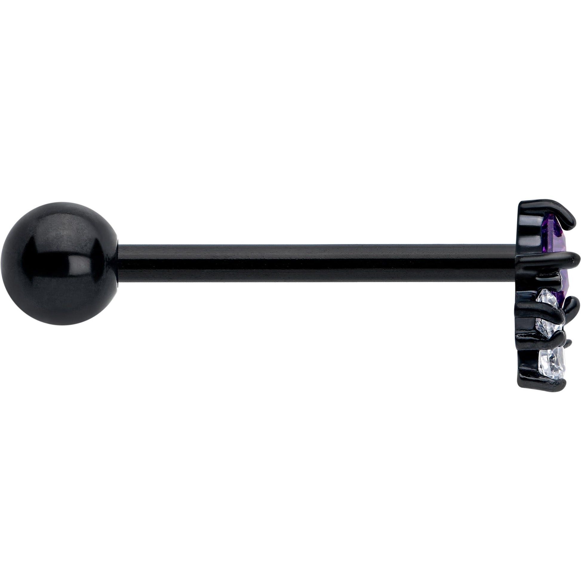 Your look is sure to be a hit when you are rocking this 14 gauge tongue jewelry. It is made with a 5/8 inch black PVD over 316L surgical grade stainless steel straight barbell with a 6mm bottom ball end. The top end features an elegant rhombus charm, with a purple cubic zirconia gem center and a trio of clear cubic zirconia gem embellishments for a color contrast you can not take your eyes off of. Make an impact with this elegant rhombus tongue piercing ring.Specifications