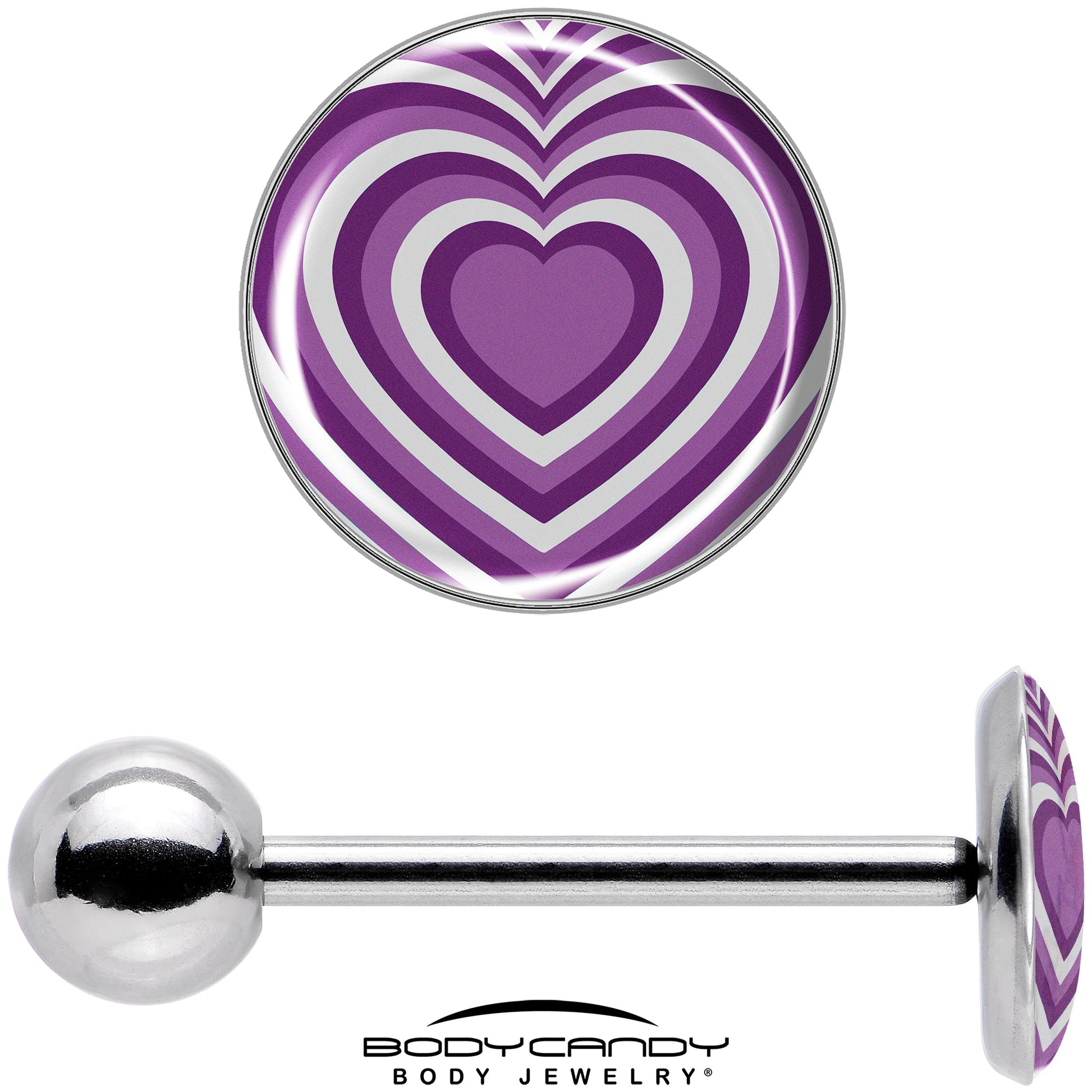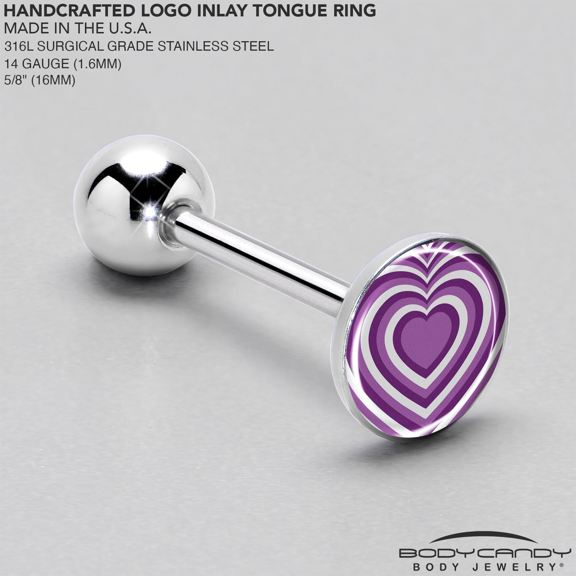 Fall in love with the trippy style of this 14 gauge tongue barbell. It's made with a 5/8 inch 316L surgical grade stainless steel straight barbell with a 6mm bottom ball end. The top end features a purple disc logo charm with a series of white and purple hearts that end with a purple heart at the center for a truly mindblowing look. You'll never want to stop looking at this trippy heart tongue piercing jewelry.