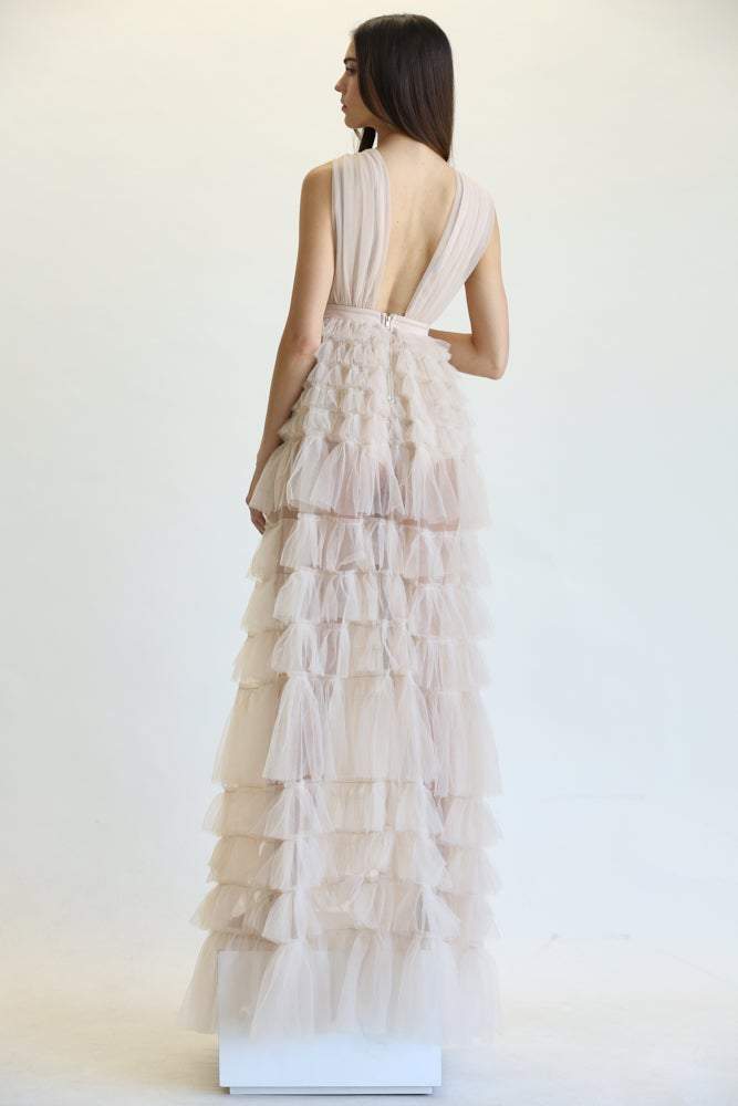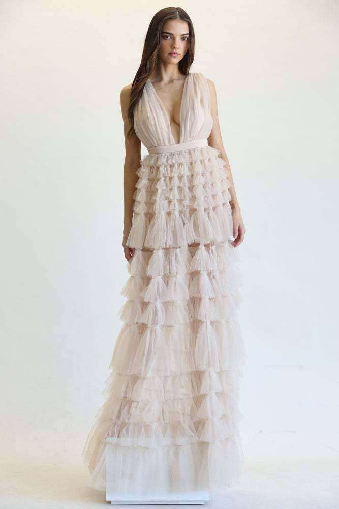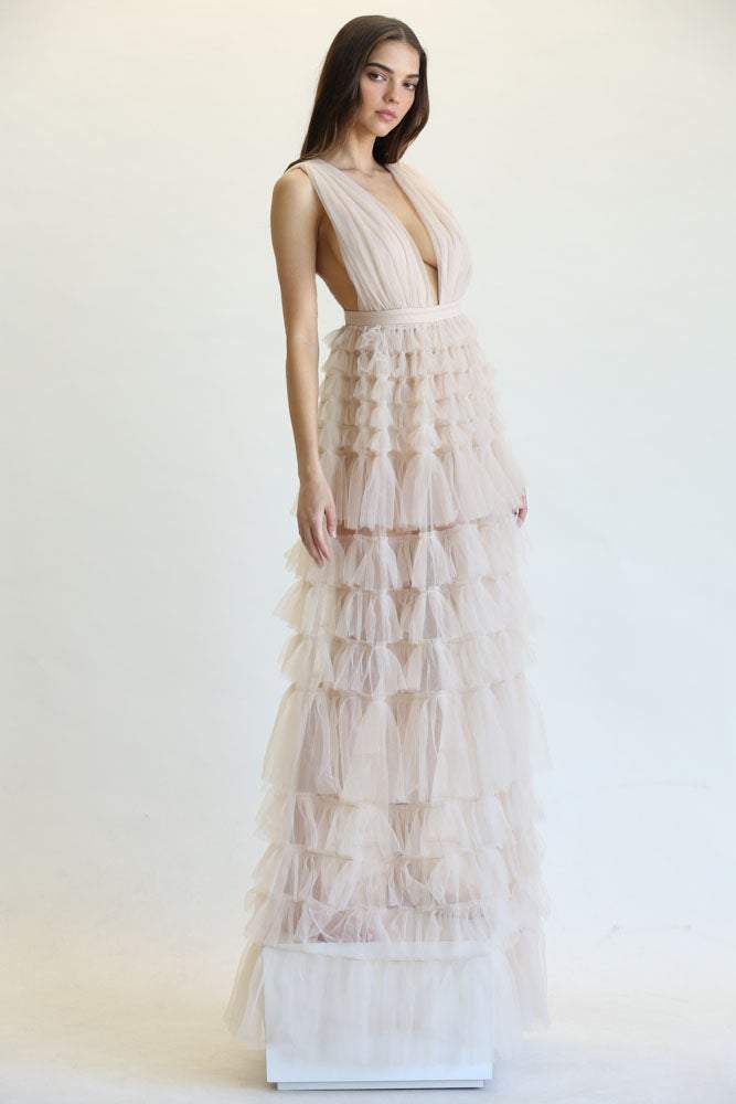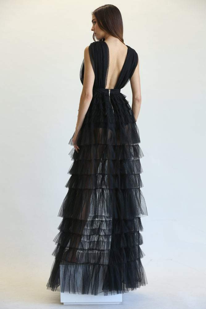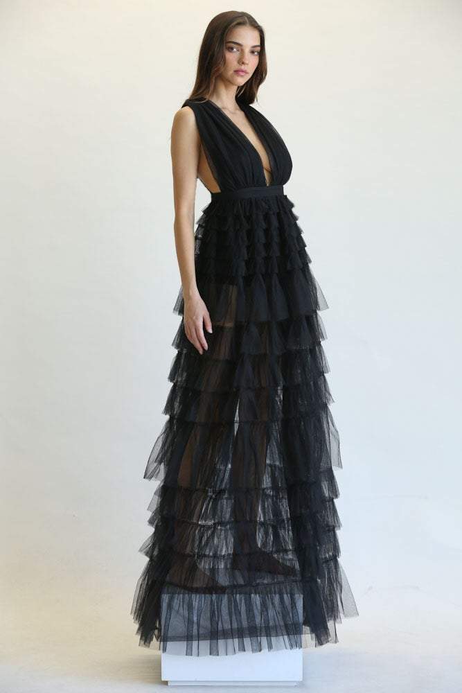 Dress- Tulle Fabric- V-neckline With Ruching- Solid Waistband- Long Ruffled Tiered Tulle Skirt- Zipper Back Closure- Lined Shorts- 100% PolyesterSize And Fit- Model Wears A Small- Model: 5'6