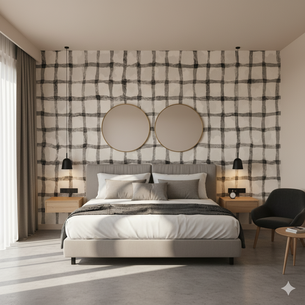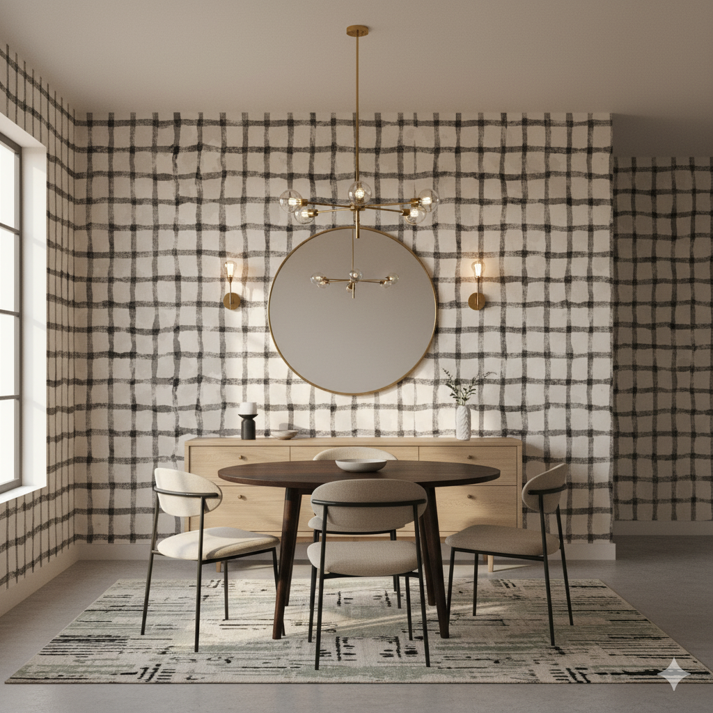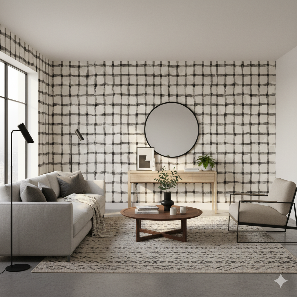 A hand-rendered check pattern with inky black strokes washed across soft ivory, Quarry Grid feels both organic and architectural. The irregular spacing and watercolor effect lend the sense of artisan brushwork, as though painted directly onto plaster walls. This wallpaper pairs beautifully with Scandinavian interiors, wabi-sabi design, or modern farmhouse settings, bringing a relaxed yet structured rhythm. Use it in kitchens, mudrooms, or offices to soften sharp lines while maintaining graphic interest. Its raw simplicity allows it to complement both muted tones and bolder design elements.