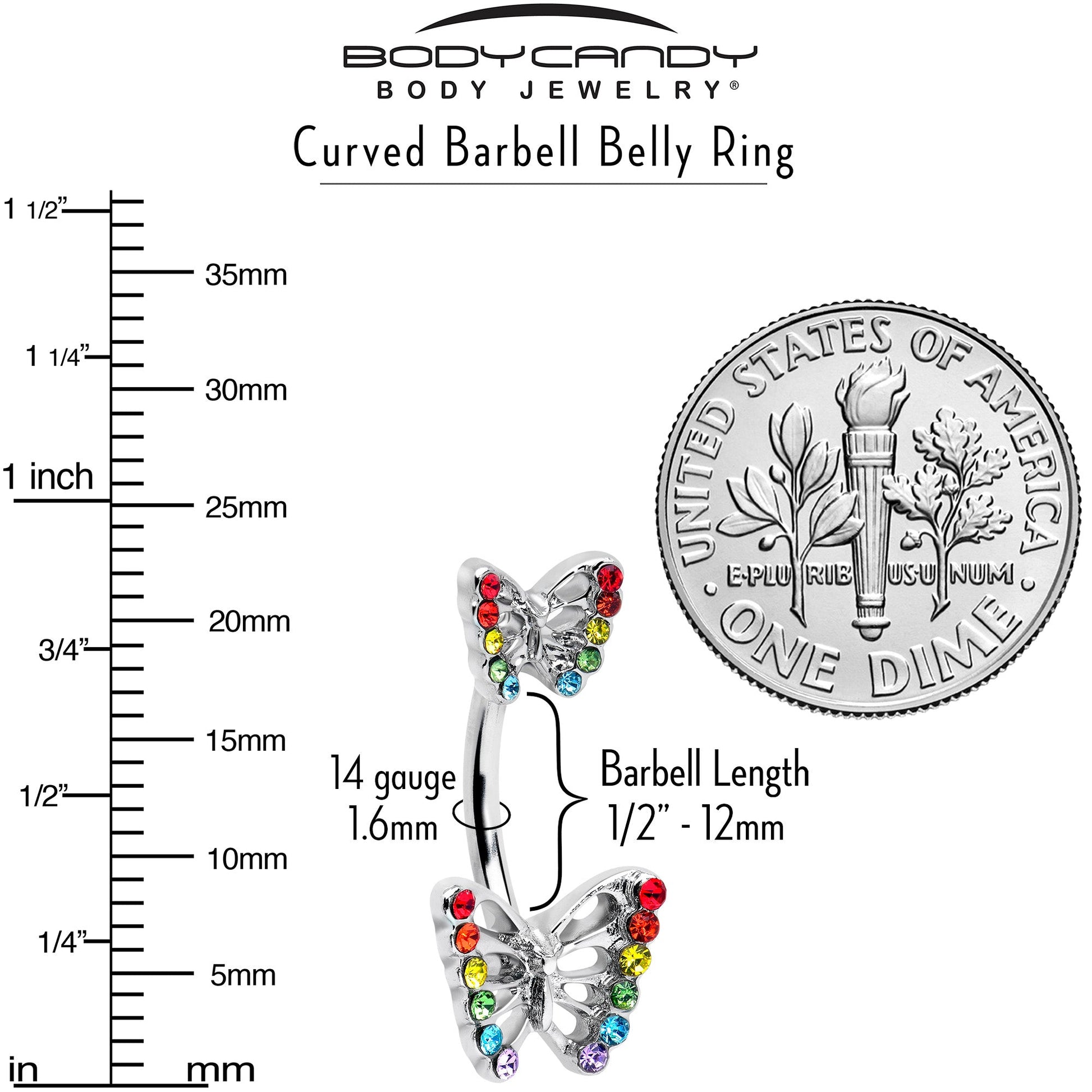 Wear your rainbow with pride, like the butterfly on this 14 gauge navel ring. It's made with a 3/8" durable 316L surgical grade stainless steel curved barbell. Each of the ends features a butterfly charm. The butterflies have open, airy wings set with gems on the outer edges. The gems form a rainbow for a bold look you'll be proud to wear. Spread your wings with pride and style with this rainbow butterfly belly piercing jewelry.Specifications