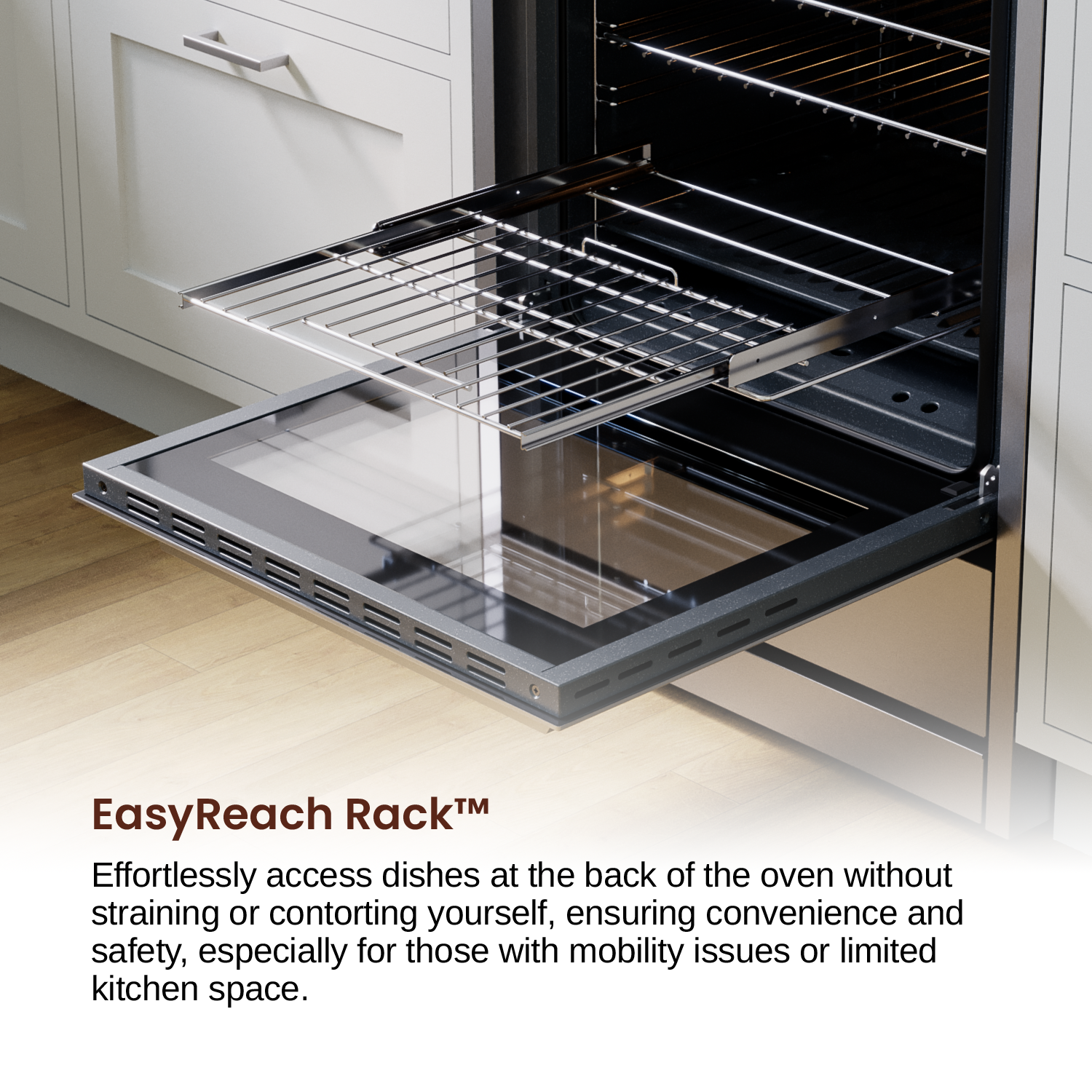 EasyReach Rack™ – Effortlessly access dishes at the back of the oven without straining or contorting yourself, ensuring convenience and safety, especially for those with mobility issues or limited kitchen space.