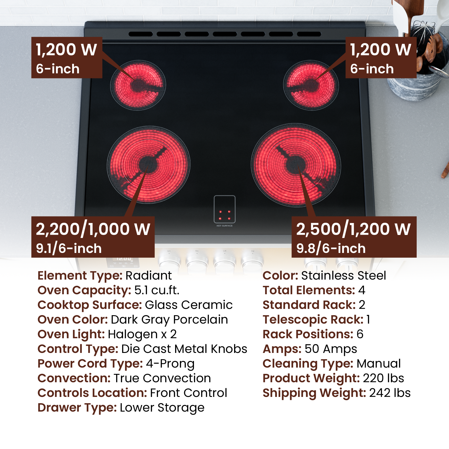 Left Front Element | 9.1"/6" 2200W/1000W | Drawer Type | Lower Storage Drawer |