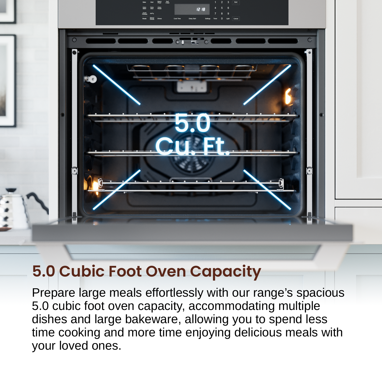 Prepare large meals effortlessly with our range’s spacious 5.0 cubic foot oven capacity, accommodating multiple dishes and large bakeware, allowing you to spend less time cooking and more time enjoying delicious meals with your loved ones.