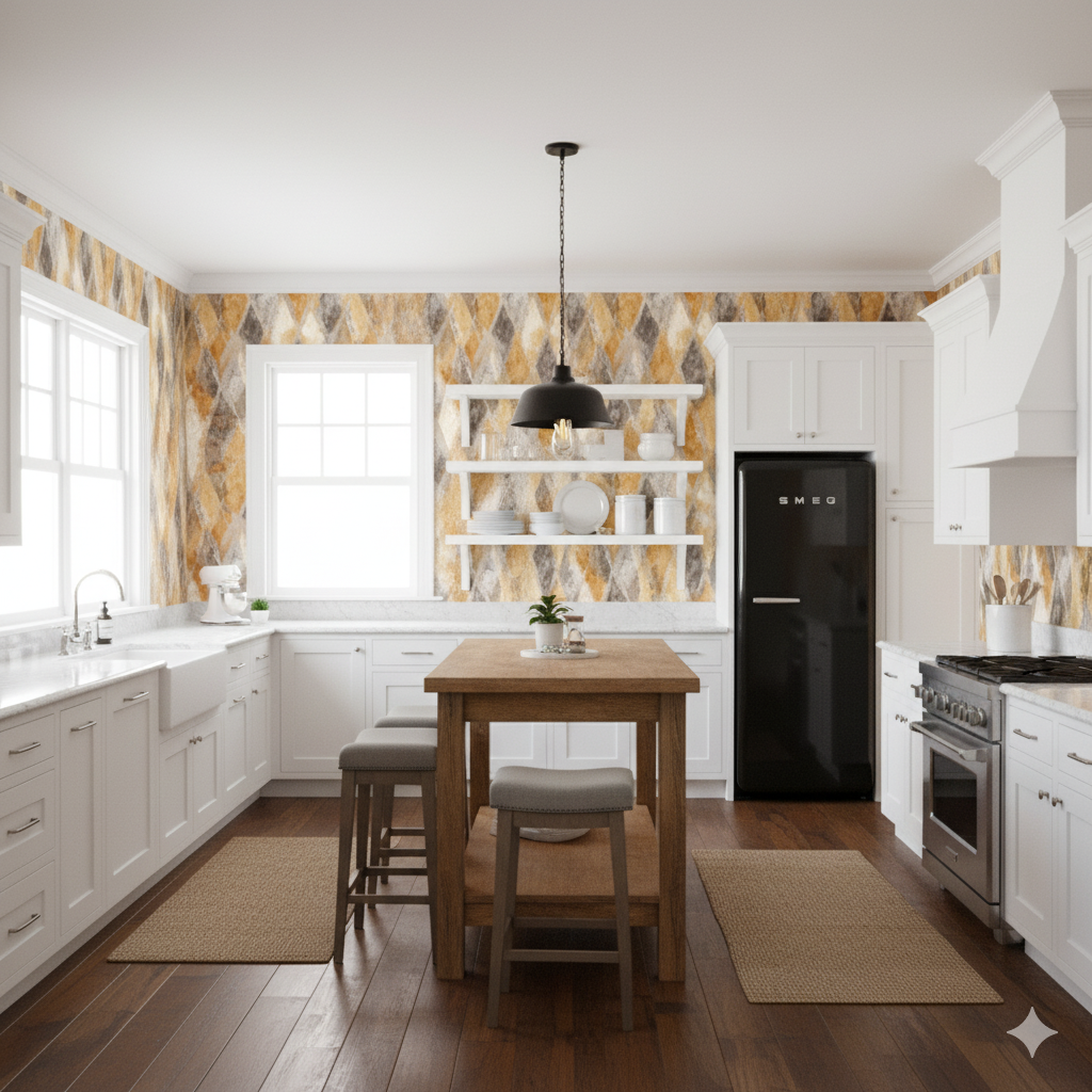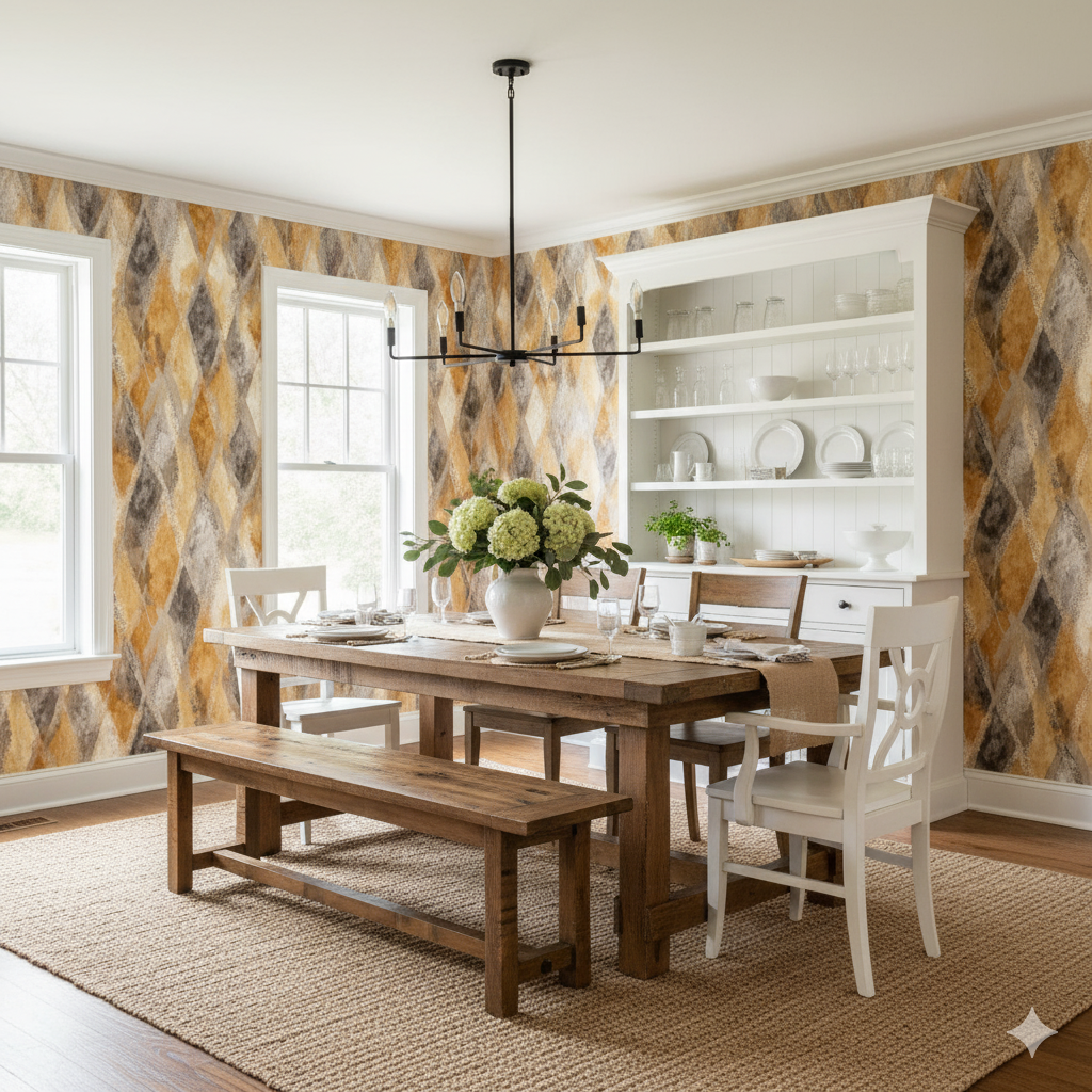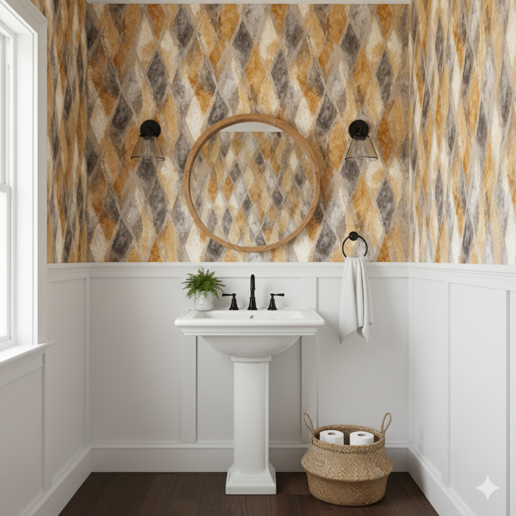 An abstract pattern inspired by rattlesnake skin, this design arranges ochre, gray, and sandy taupe diamonds into a rhythmic, painterly lattice. The tones evoke desert landscapes at dusk, with soft gradients that keep the look sophisticated rather than literal. This wallpaper suits modern desert homes, Western-themed interiors, or eclectic accent walls where geometric and natural influences collide. A strong fit for those looking for diamond-pattern wallpaper, snake-skin inspired prints, or Southwestern geometric motifs.