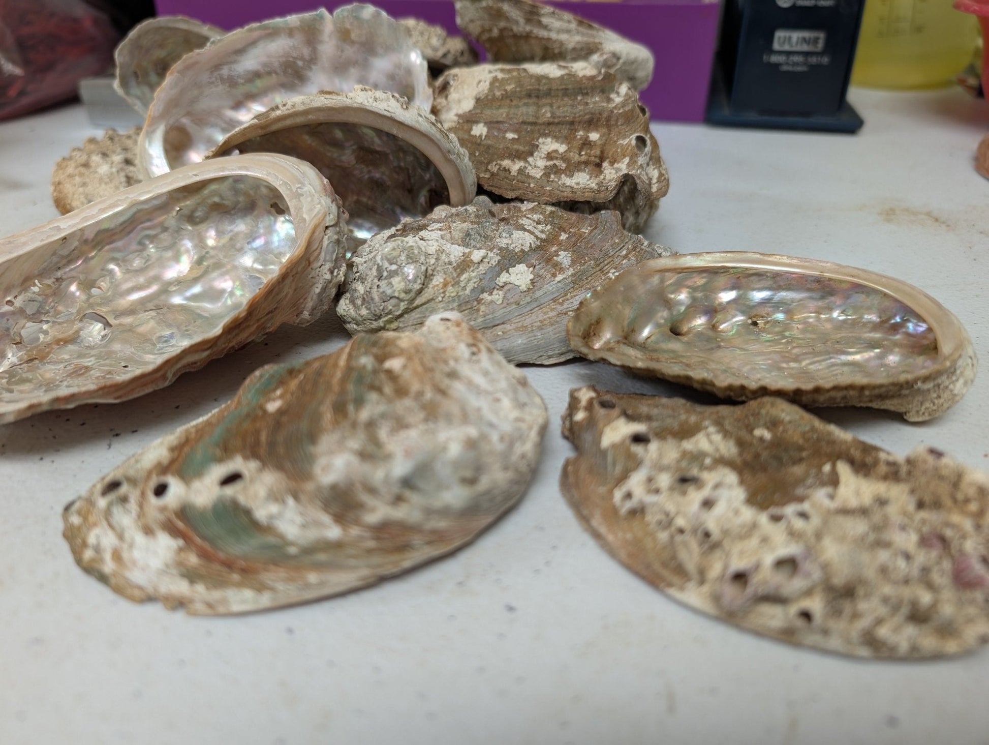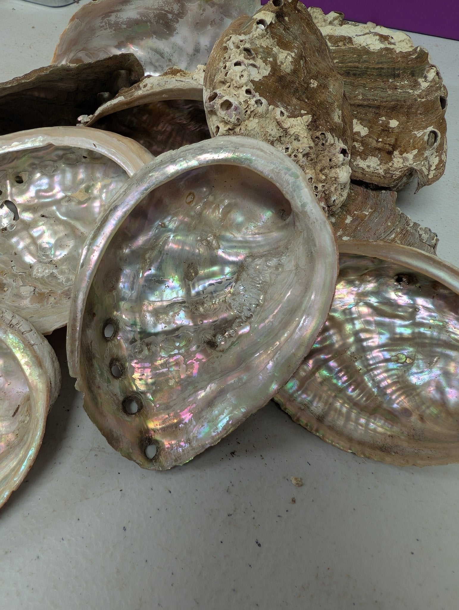 The highly iridescent inner layer of the shell of abalone has traditionally been used as a decorative inlay on jewelry, buttons, furniture, musical instruments such as guitars, knife handles & many other shell crafts. Abalone shells are a marine snail commonly called ear shell, sea ear.