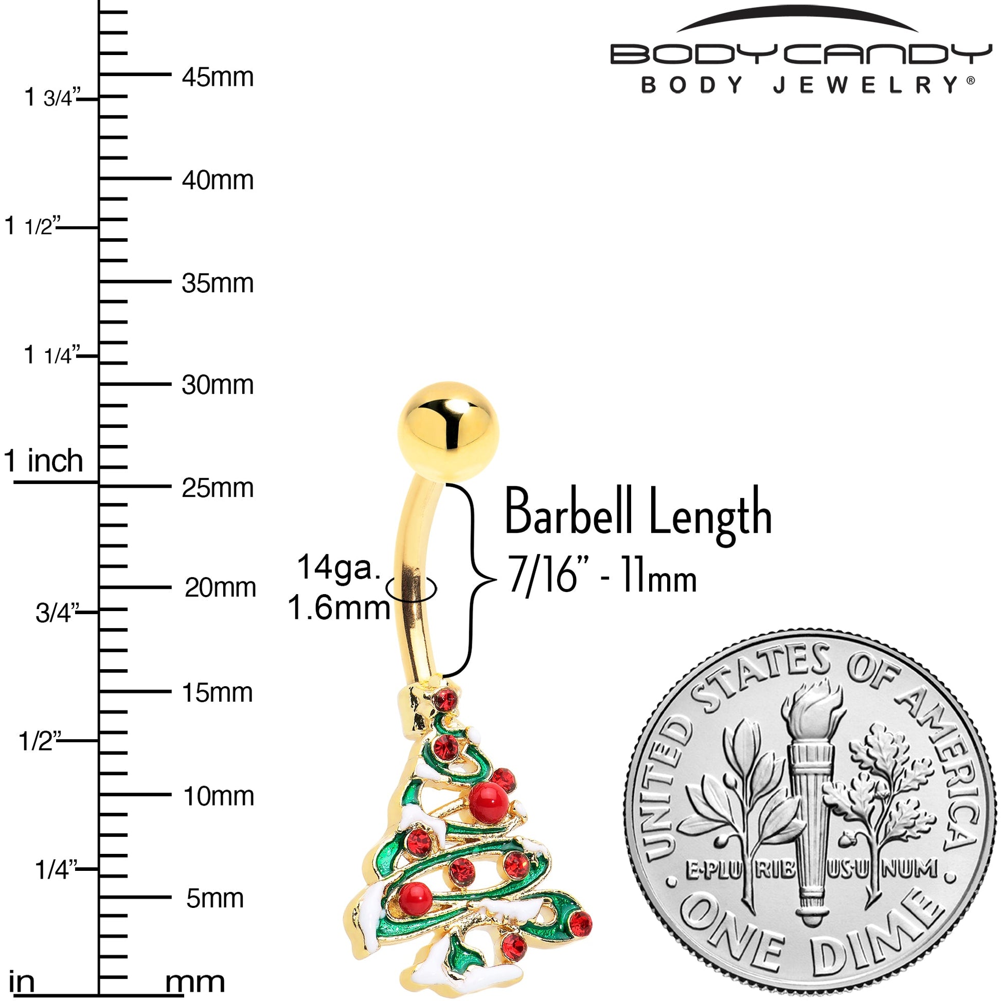 Red Gem Gold Tone Snowy Christmas Tree Holiday Belly Ring