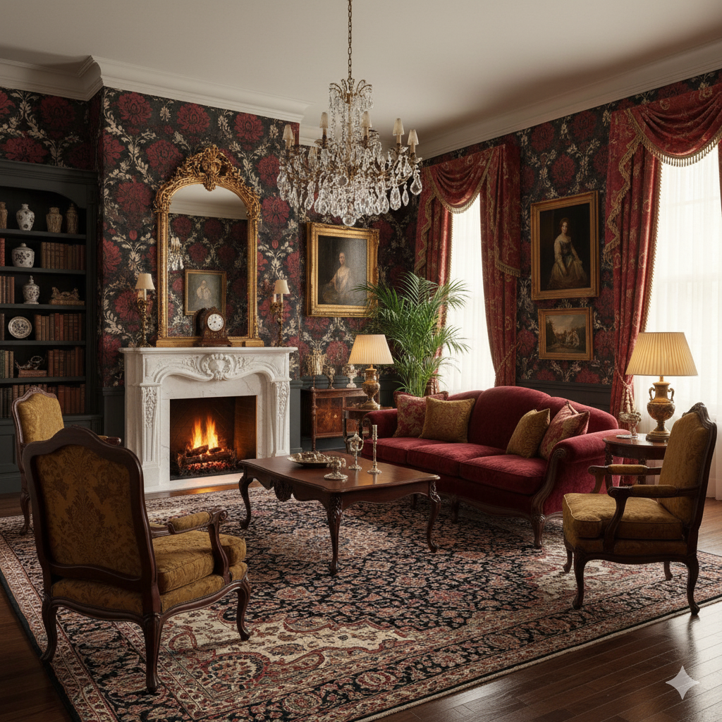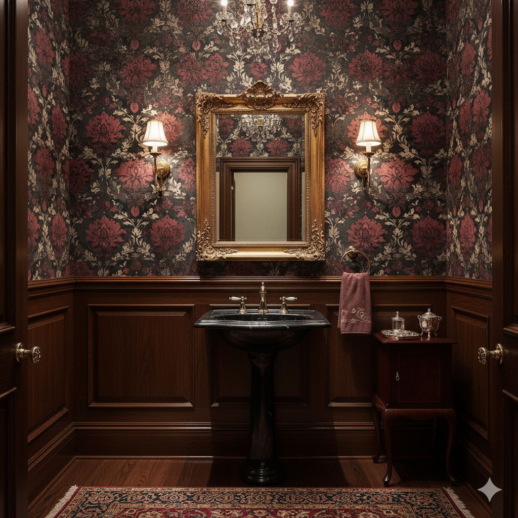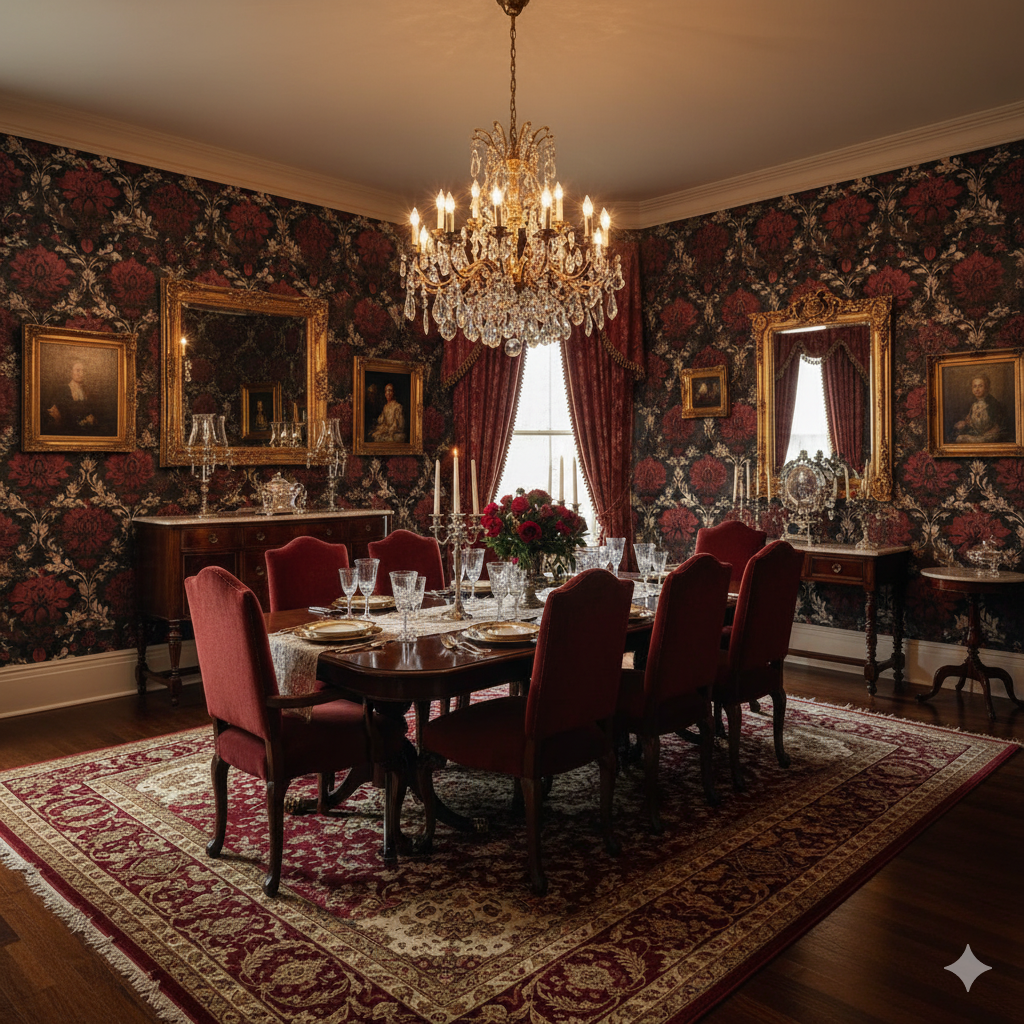 A moody, heavily textured floral pattern in deep crimson, shadowy charcoal, and antique parchment tones. The weathered backdrop and bold damask-style blooms create an atmosphere of historic opulence tinged with gothic drama. Perfect for dining rooms, lounge bars, or heritage-style interiors where mood and intensity matter, this wallpaper makes a strong statement. It appeals to those searching for dark floral wallpaper, gothic-inspired prints, or dramatic vintage interiors with texture and depth.