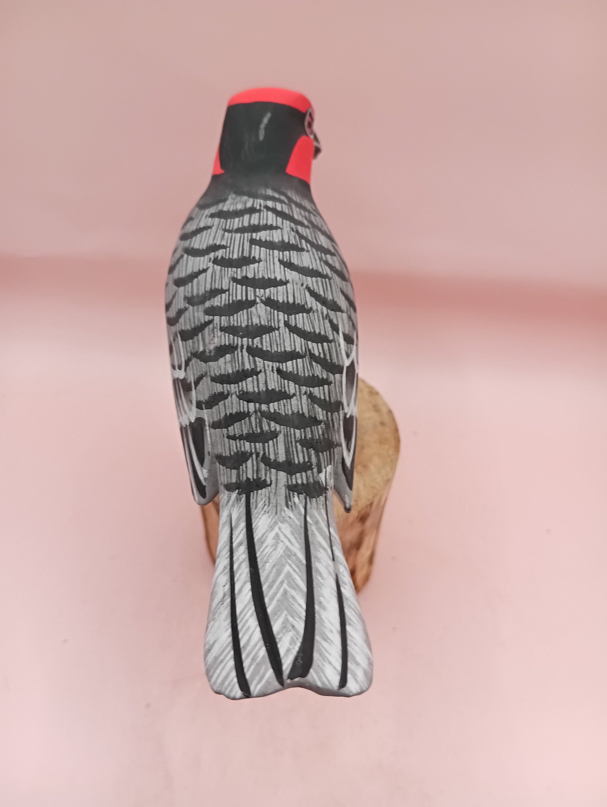 Add a bold pop of color to your space with our charming Red Songbird Décor piece. This hand-painted wooden bird features striking red and black accents with intricately detailed gray feathering, perched securely on a natural wood base. Whether placed on a shelf, desk, or side table, this decorative bird brings a touch of whimsy and woodland charm to any room.