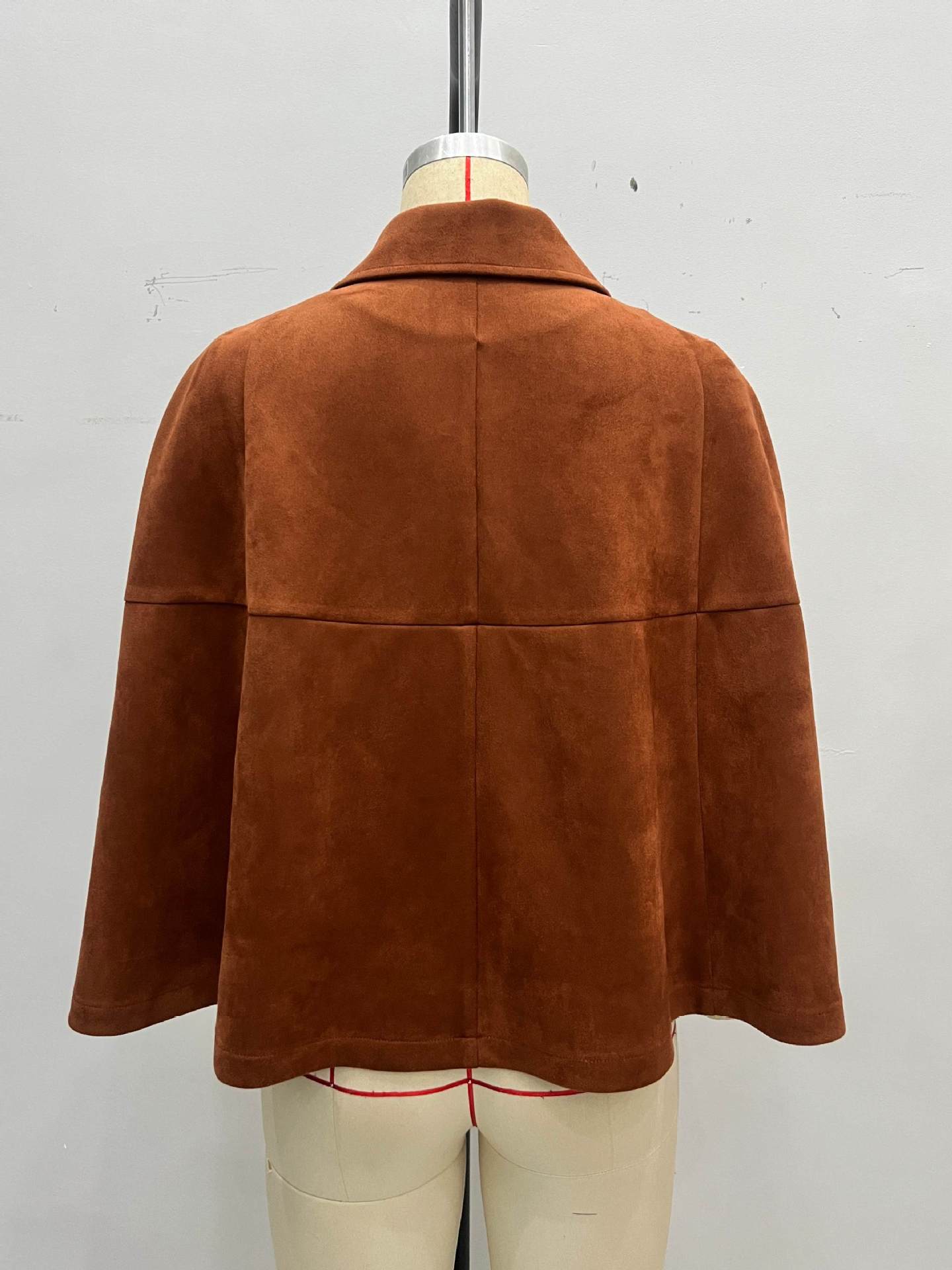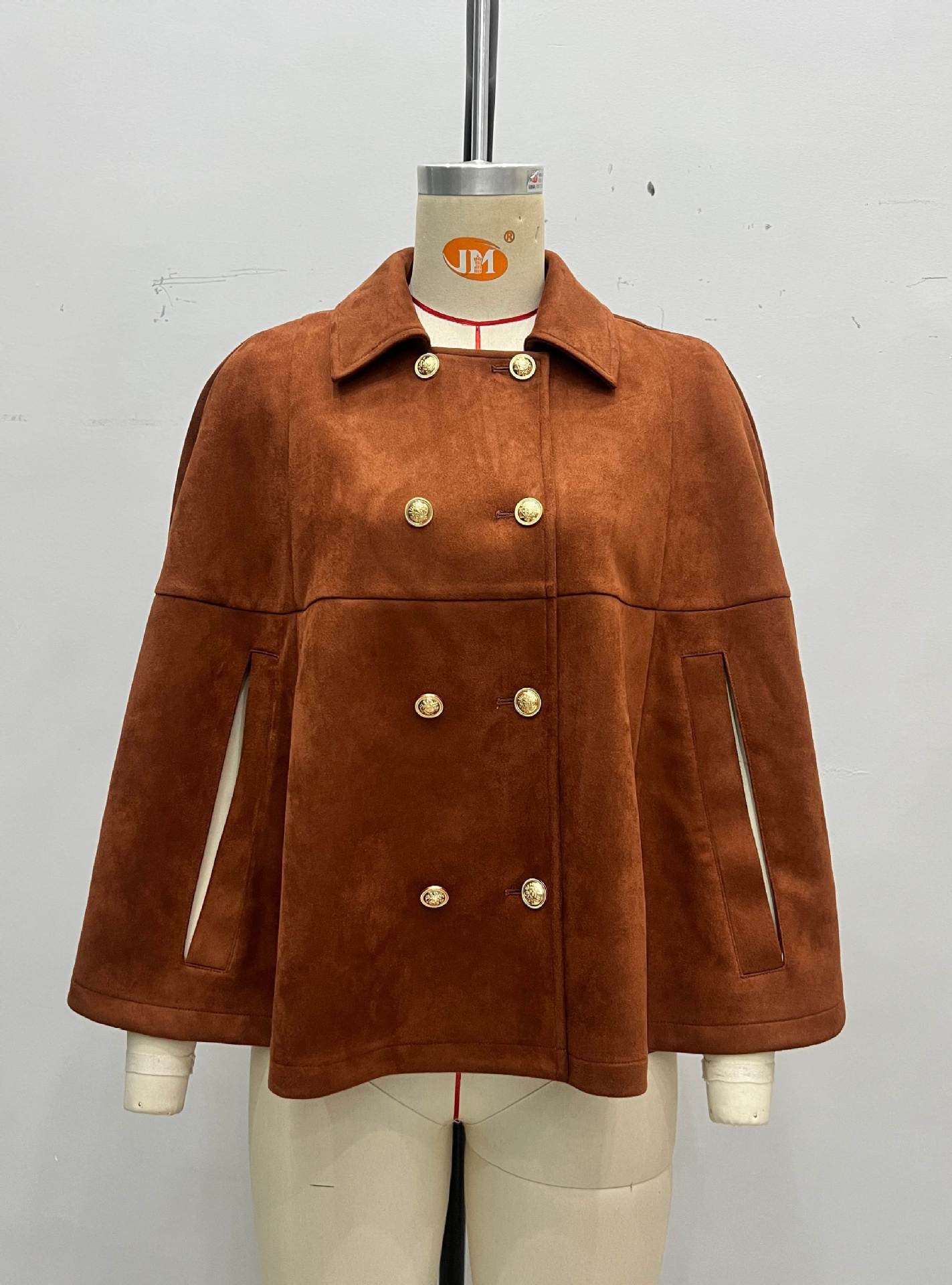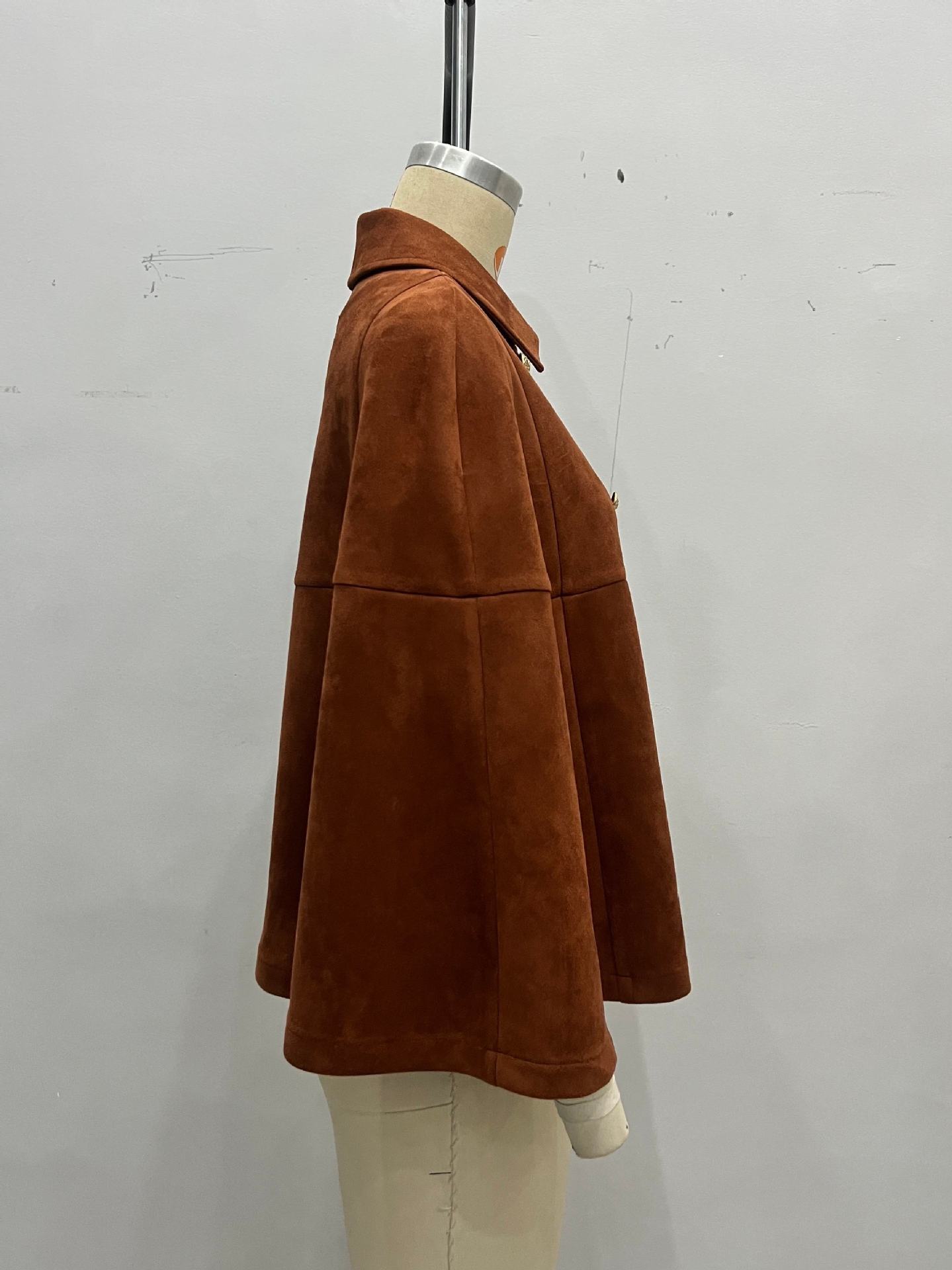 Retro Loose Design Double Row Metal Buckle Decorative Design Collared Brown Suede Cape Coat