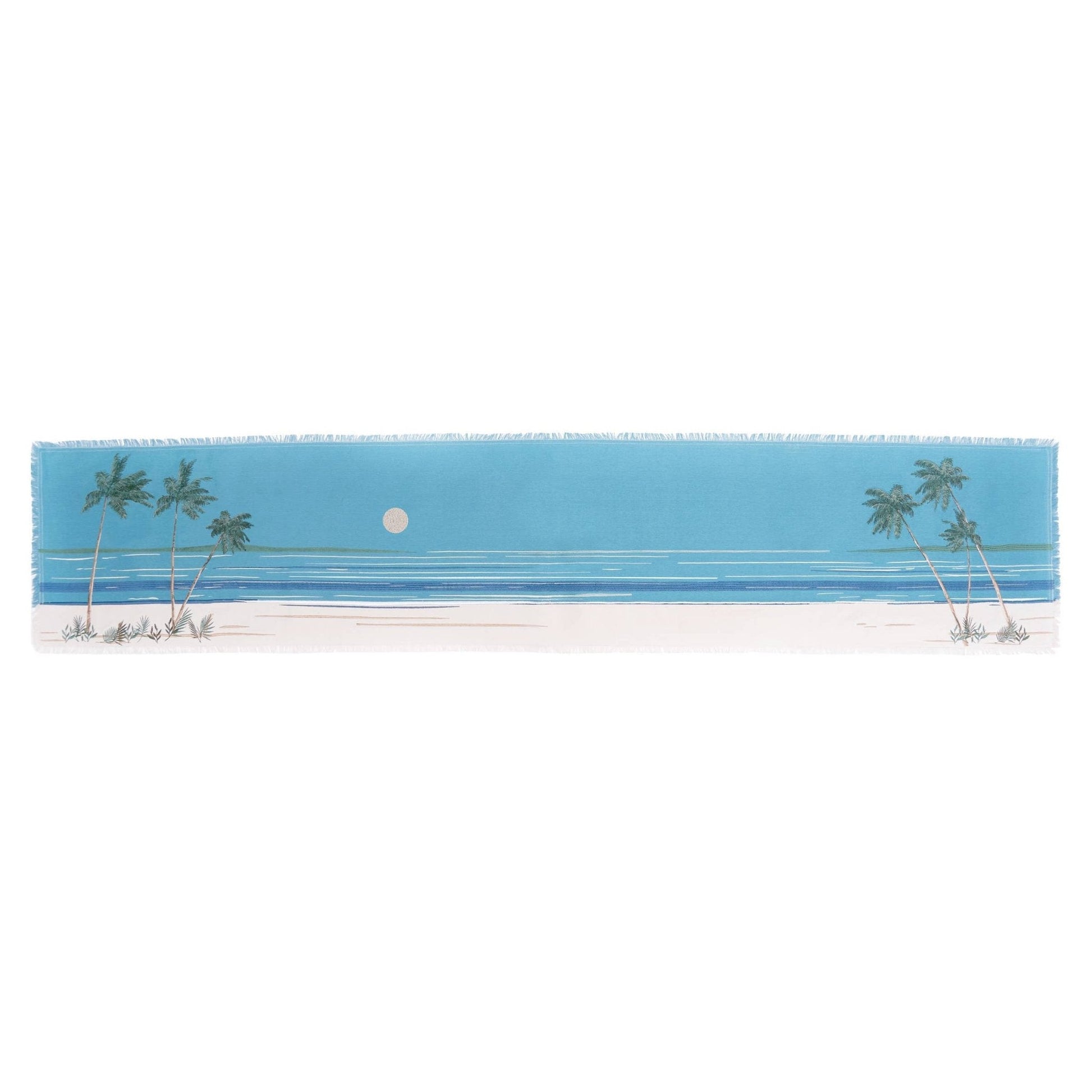 Palm trees gently sway in the island breeze on this beautifully embroidered Retro Palm Tree Table Runner, creating a tranquil beach scene that adds a relaxed, tropical touch to any tablescape. The vibrant blue background evokes the serenity of the ocean, while delicate embroidery brings the lush palm trees to life. Designed with fringe edging, this table runner blends casual elegance with coastal charm, making it a perfect accent for beach-inspired dining spaces.