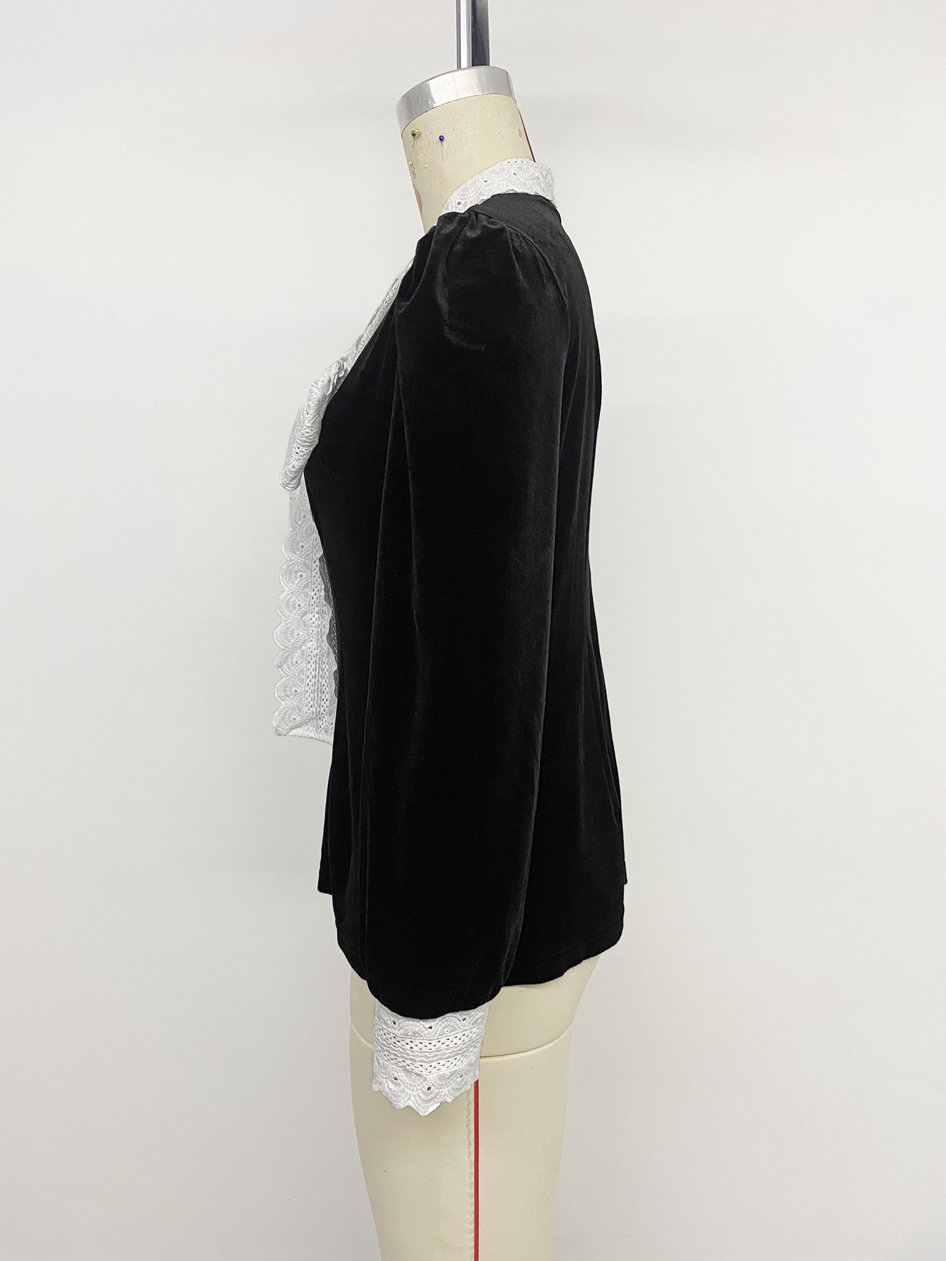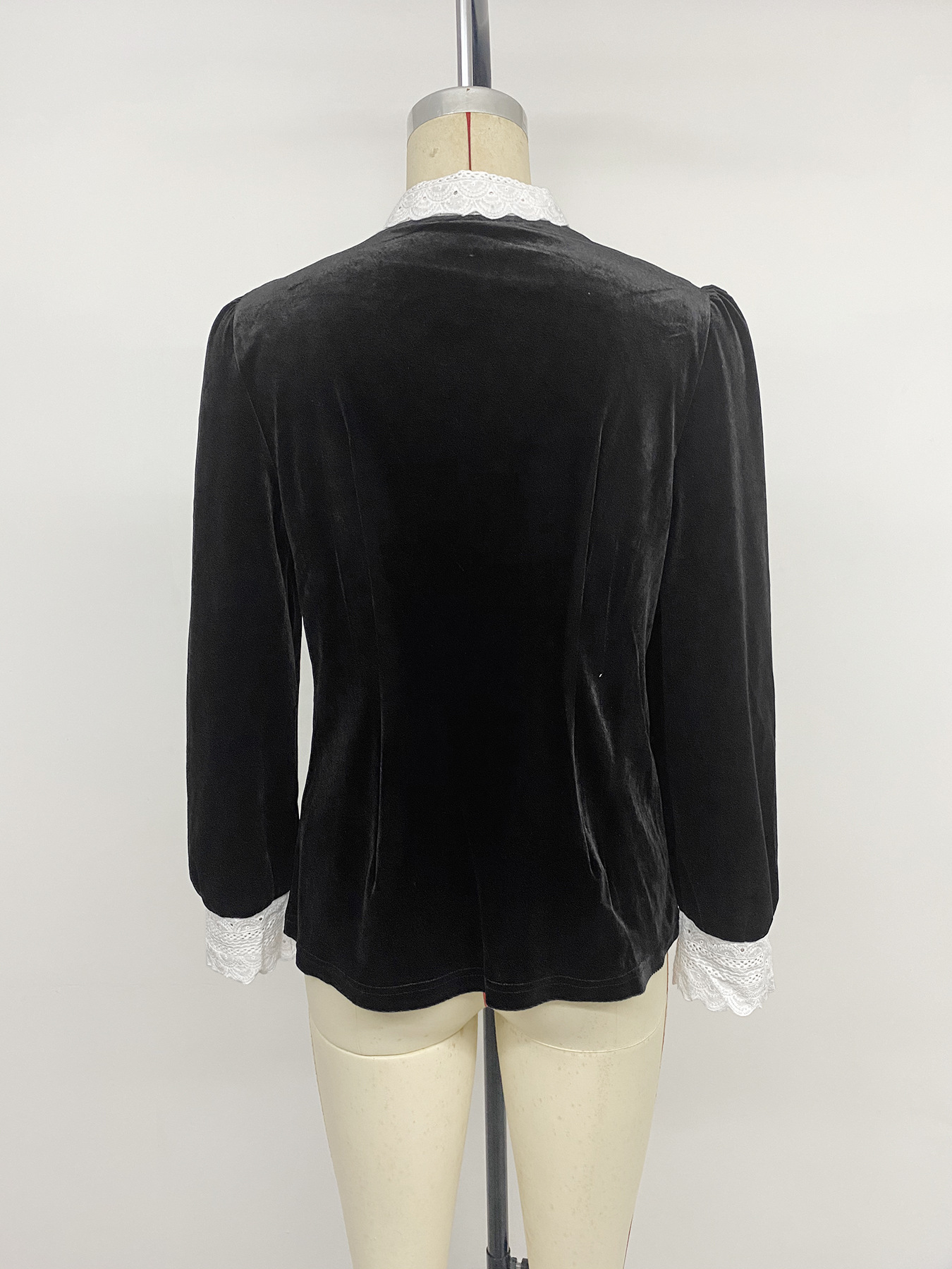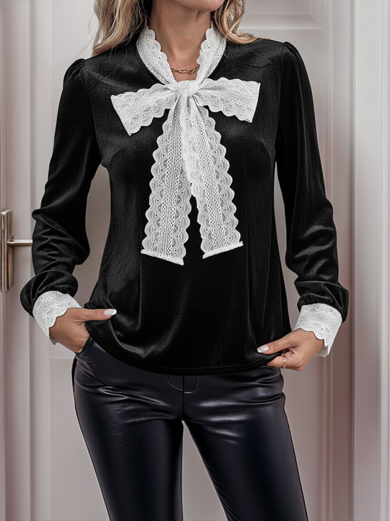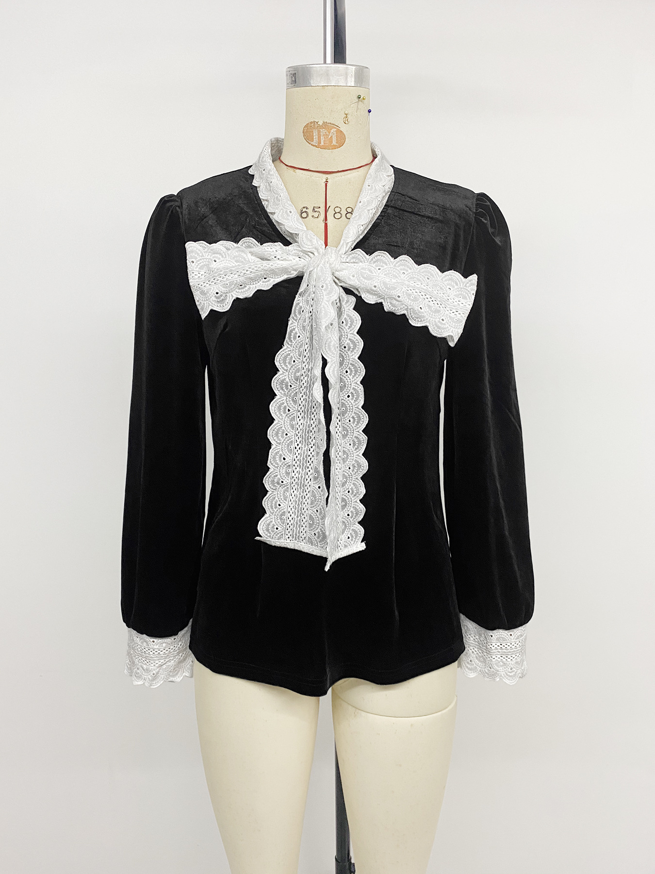 Retro Patchwork Lace Lace Collar Long Sleeve Bow Velvet Shirt Women Autumn Winter