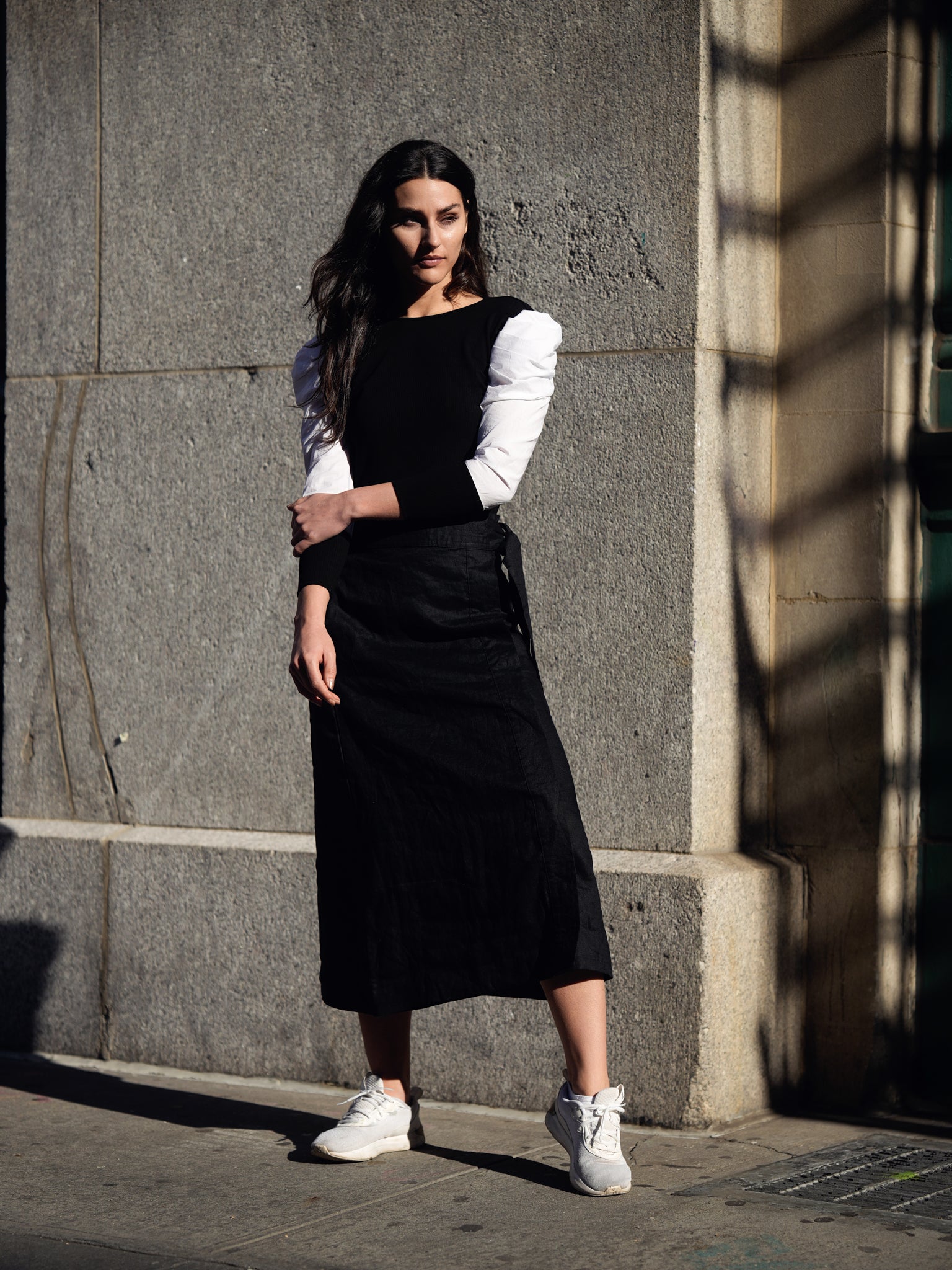 This black ribbed shirt features white cotton puff sleeves for a unique, stylish look. The ribbed design ensures a comfortable and secure fit, while the puffy sleeves add a fashionable touch to any wardrobe.