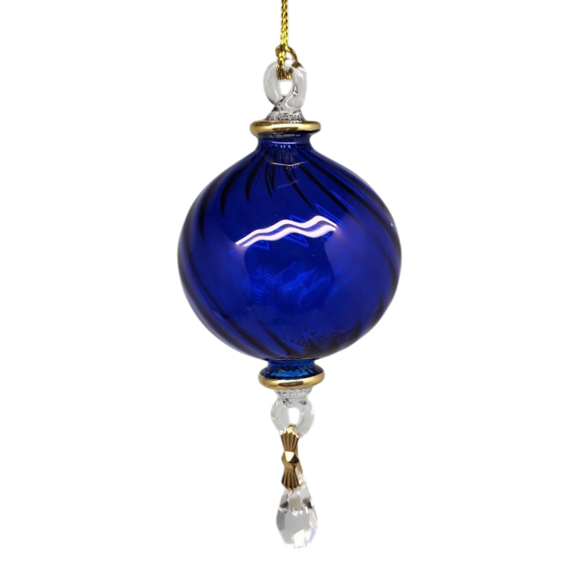 Elevate your holiday decor with our stunning mouth-blown glass ornament, crafted in the enchanting land of Egypt. This exquisite piece stands at just over 4 inches tall and embodies a rich tradition of artisanal glass-making. The vibrant deep blue hue is beautifully enhanced with elegant swirls and accented by genuine 24K gold—a touch of opulence that turns any ordinary tree into a winter wonderland. Whether it hangs on a cozy Christmas tree or adorns your home throughout the year, this ornament is bound to catch any eye and spark conversation.