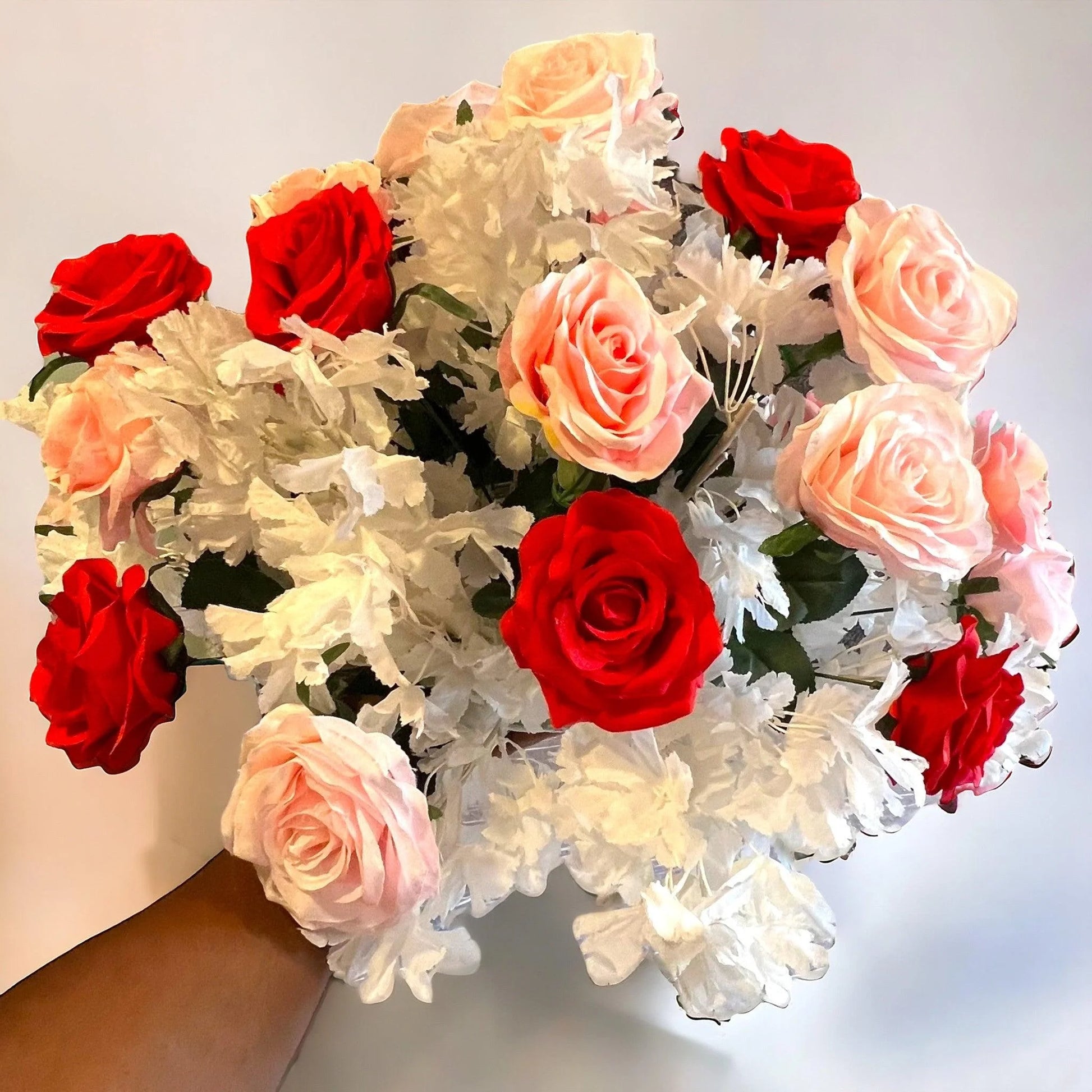 - The bouquet features a harmonious blend of artificial roses and hydrangeas in shades of red, pink, and white, lending a romantic and enchanting vibe to any setting.