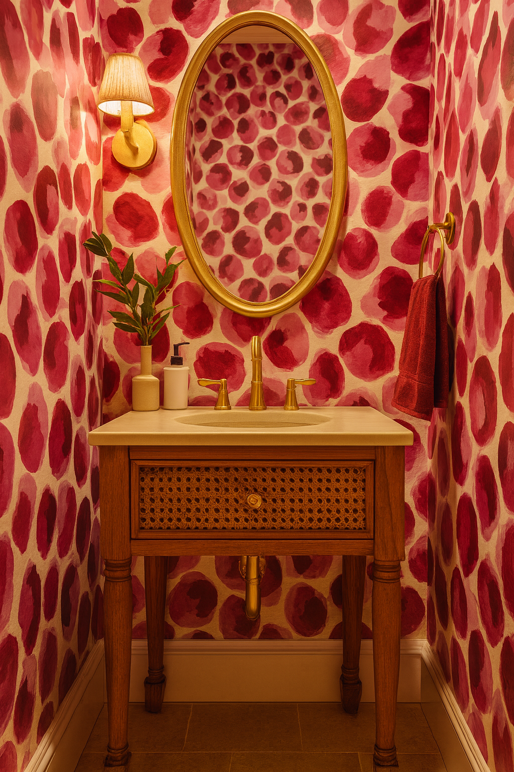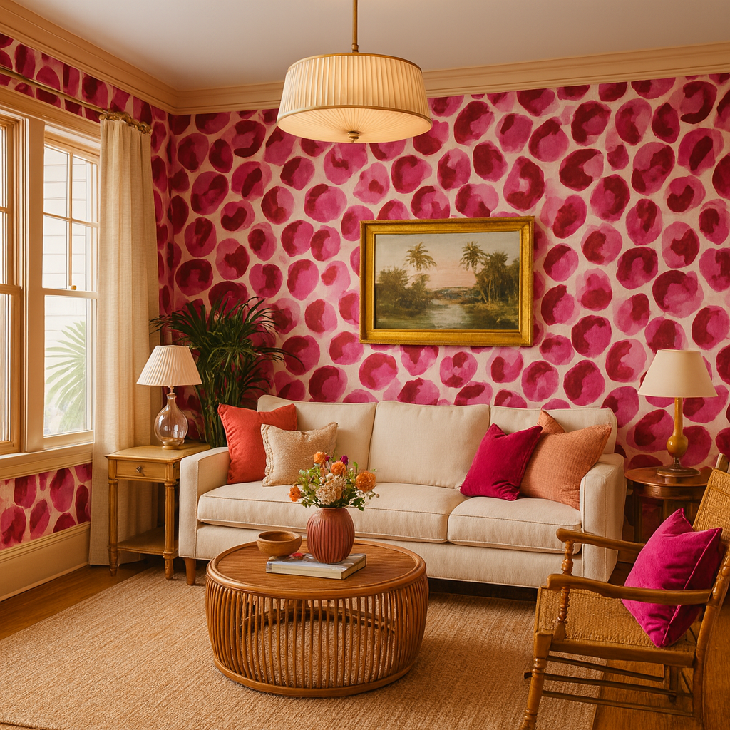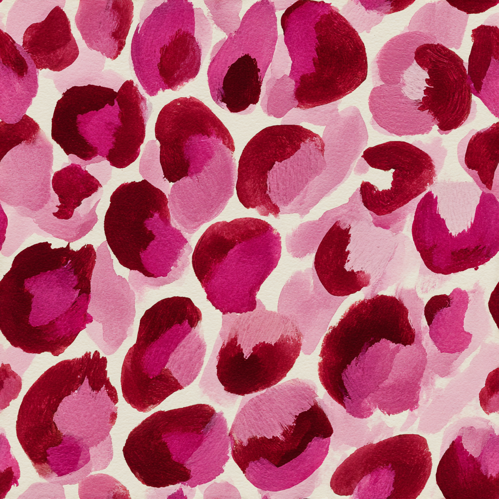 Loose, irregular leopard-like spots in crimson and pinks wash across a pale ground, painted with a gestural hand that feels both wild and artistic. The strokes shift between translucent blush tones and deep wine hues, giving the pattern a layered vibrancy reminiscent of abstract expressionism. Rose Ember strikes the balance between animal print and painterly spontaneity, making it a versatile choice for modern interiors. It works beautifully in dressing rooms, cocktail lounges, or accent walls where confidence and boldness are desired. In more subtle settings, it can inject unexpected sophistication, especially when paired with mid-century furnishings or matte black accents.