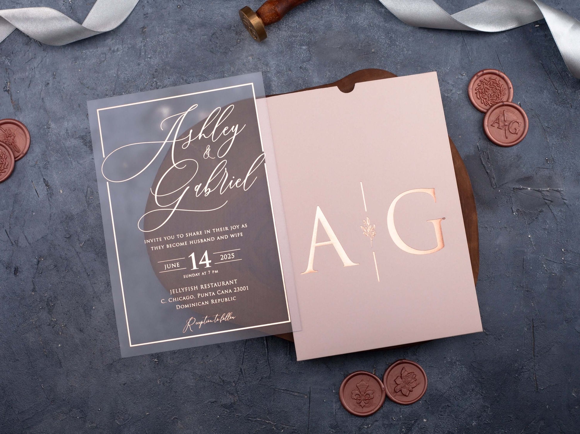 Rose Gold Foil Acrylic Wedding Invitation with Blush Pink Envelope