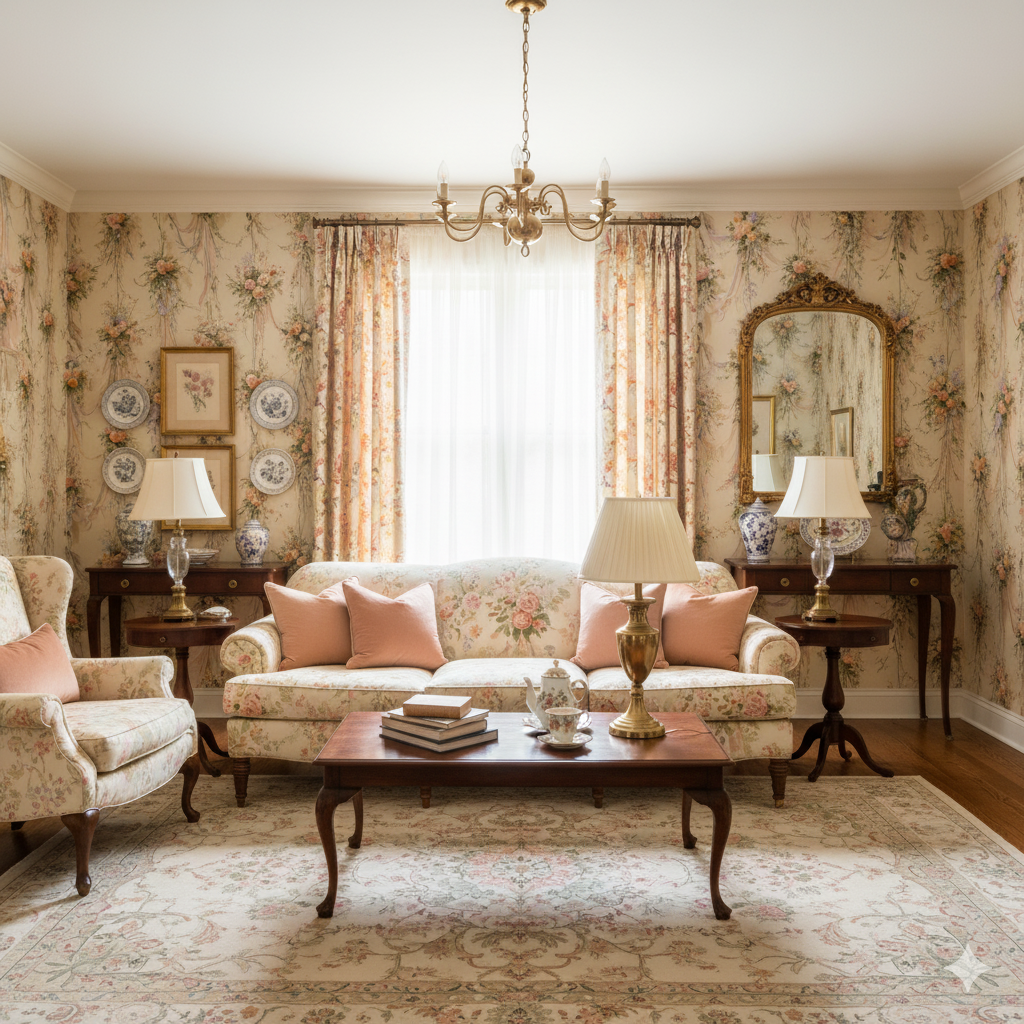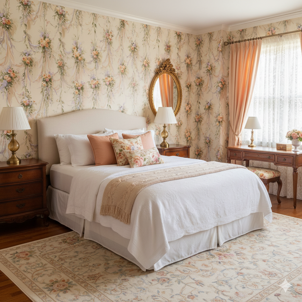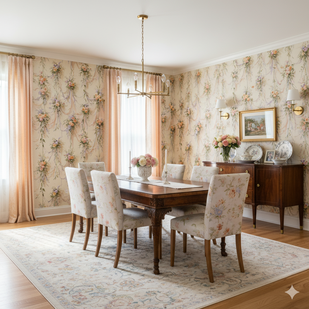 Bouquets of roses and wisteria tumble from tied ribbons, arranged vertically like floral chandeliers across the wall. The composition creates rhythm and elegance, elongating a space and drawing the eye upward. Peach, lavender, and blush flowers are accented by trailing greenery on a soft cream background, making the pattern versatile across traditional and transitional interiors. Whether used in a grand dining room, a romantic bedroom, or even a luxury retail environment, this wallpaper bridges formality with a sense of softness. The cascading nature makes it particularly effective for tall walls, emphasizing vertical scale.