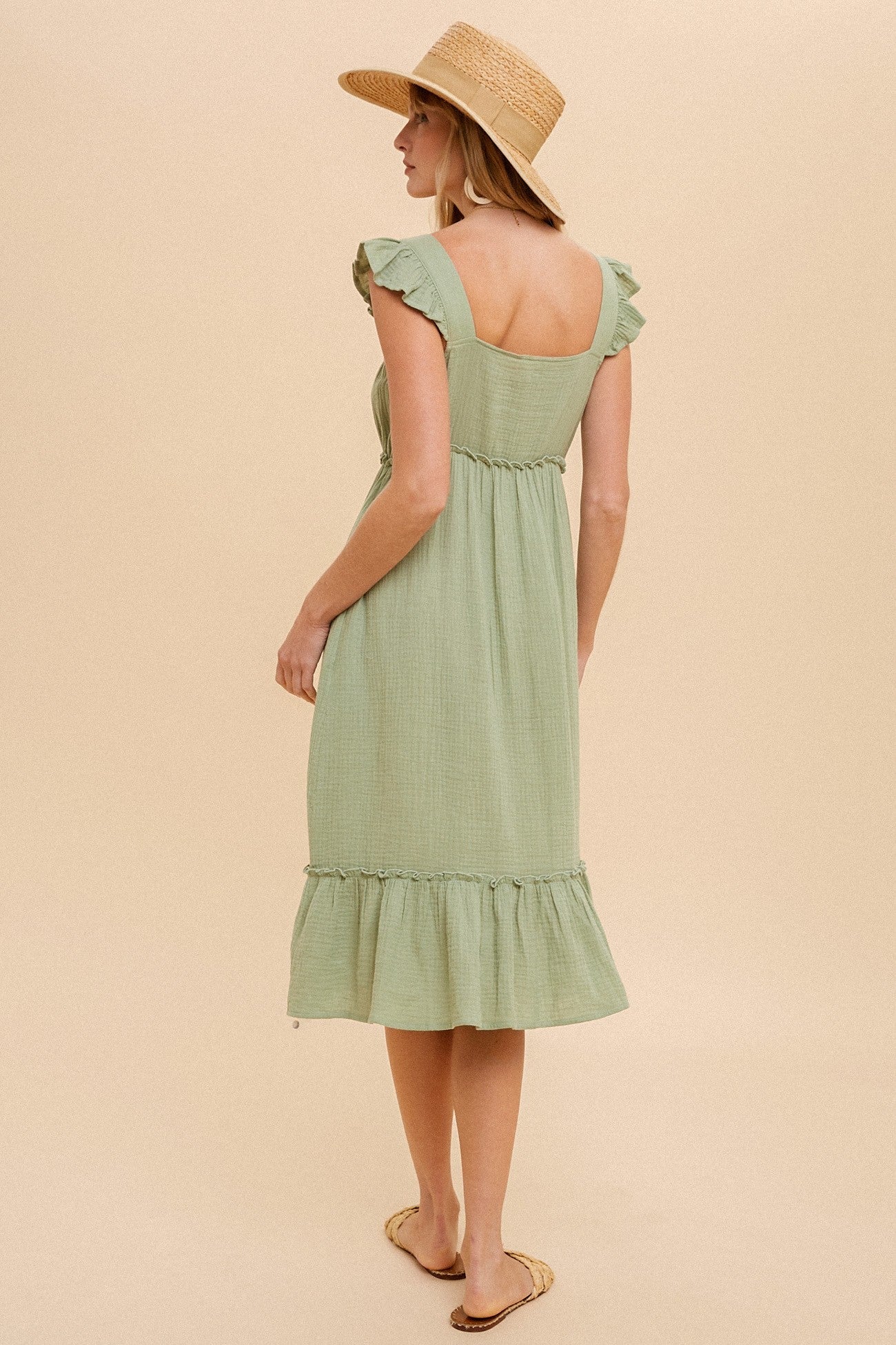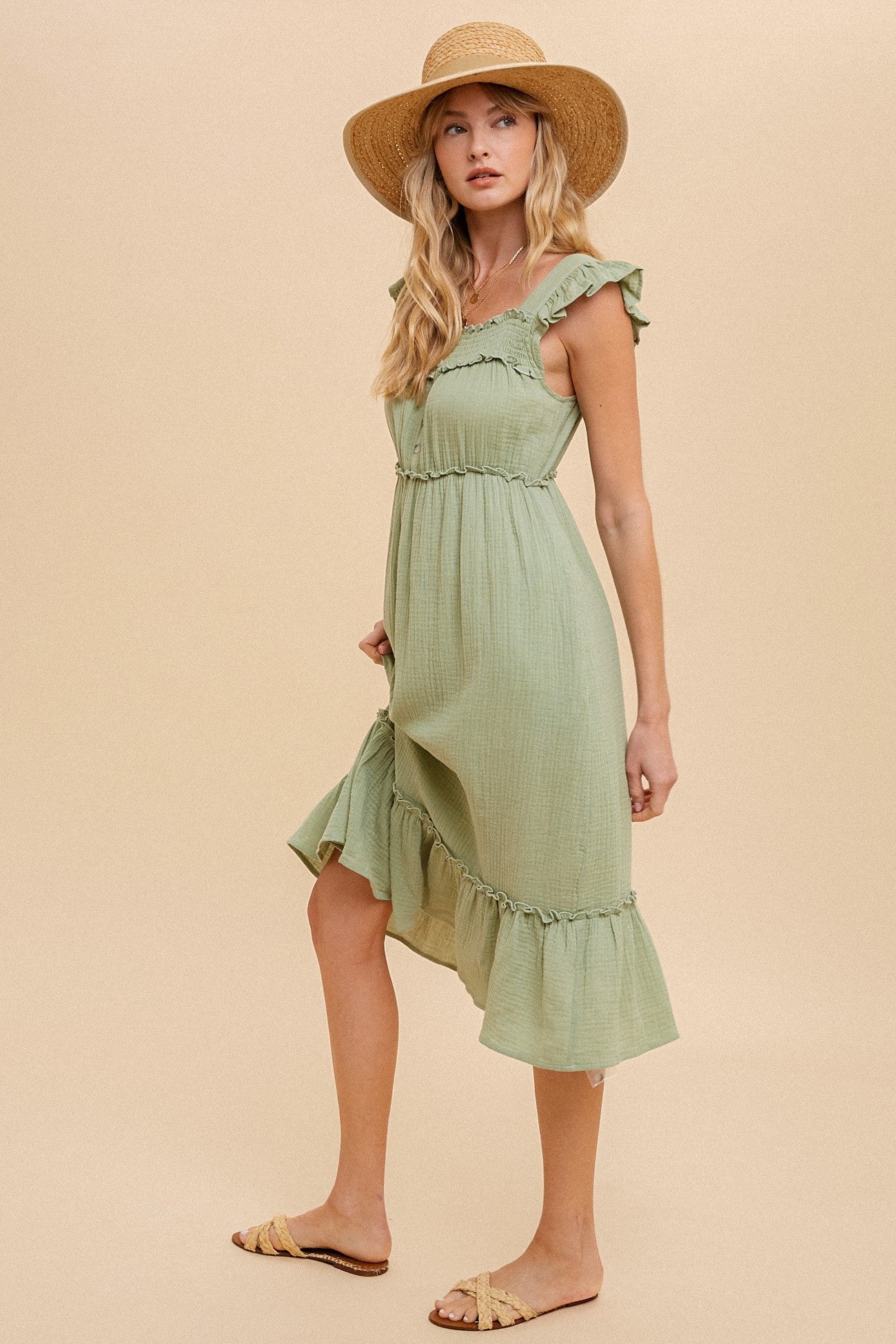 The Ruffle Sleeve Tiered Midi Dress is a beautifully feminine piece featuring soft ruffle sleeves, a flattering tiered silhouette, and a graceful midi length. Perfect for any occasion, this dress offers effortless charm and elegance with every wear.