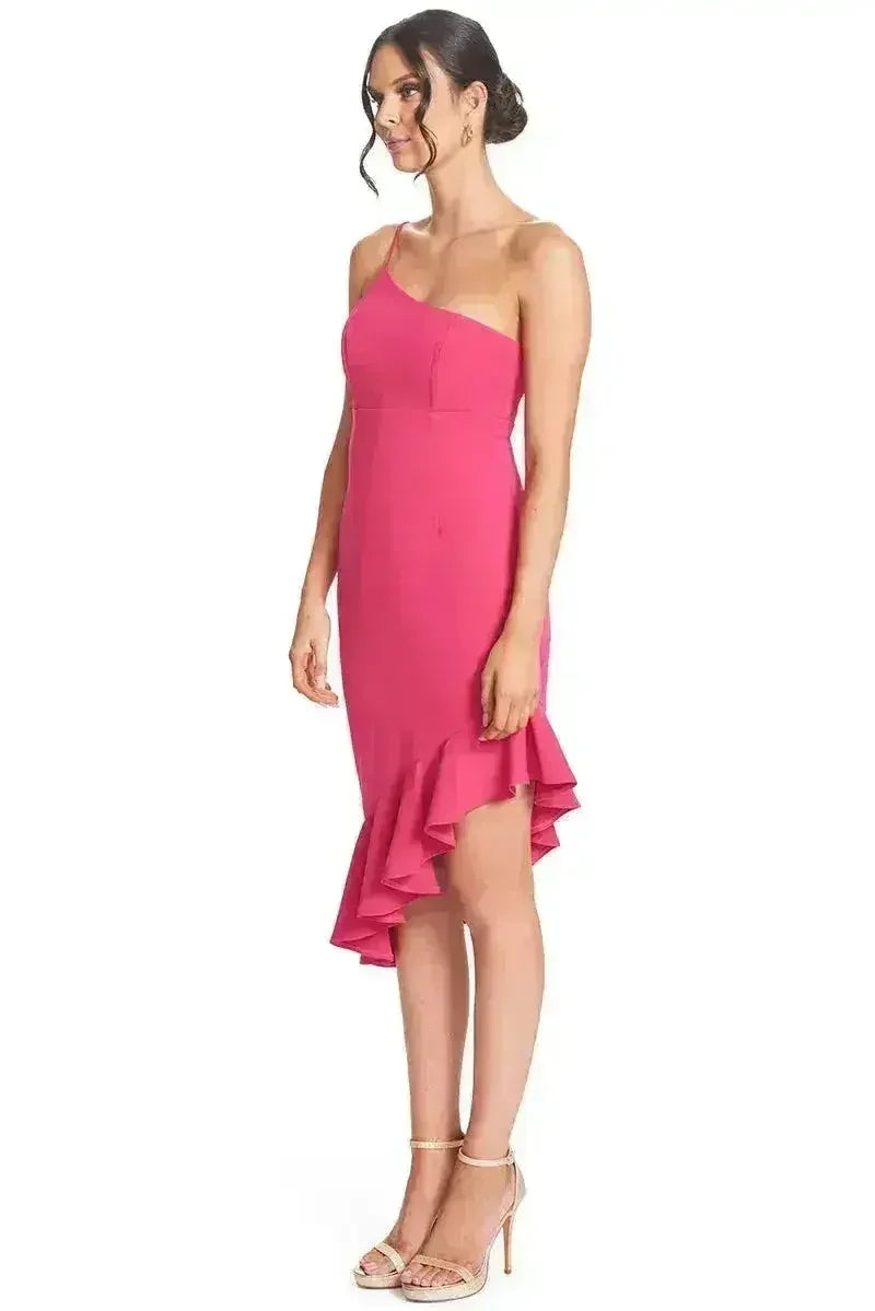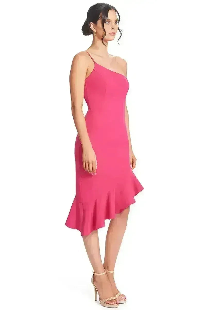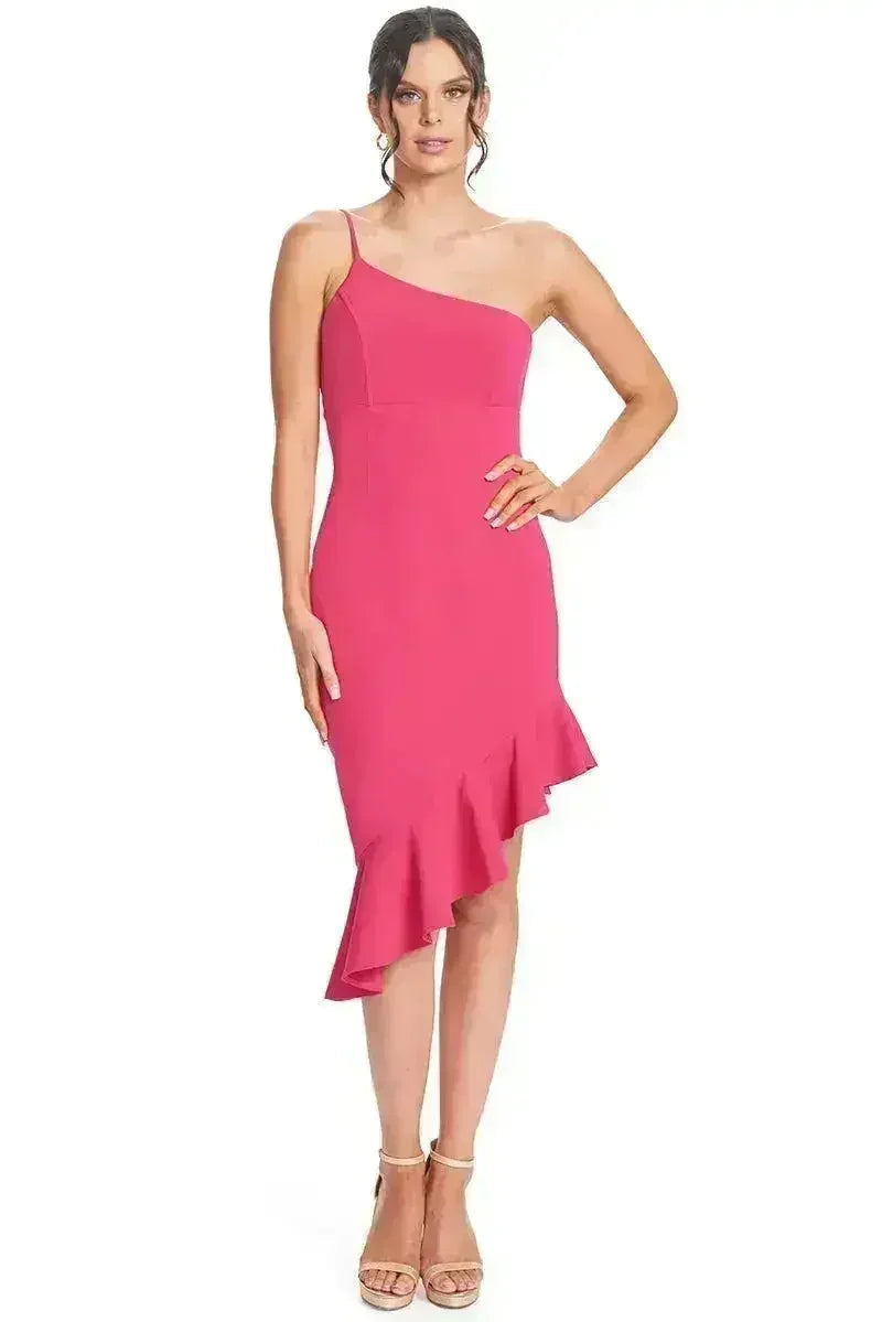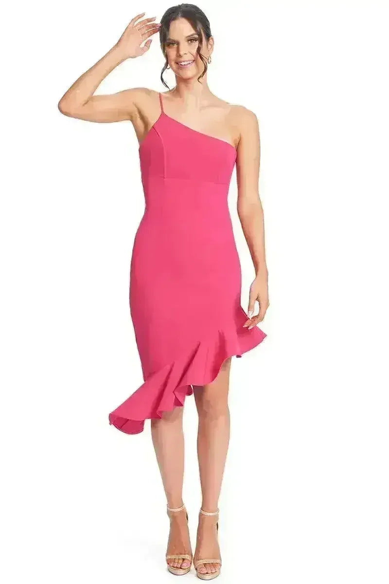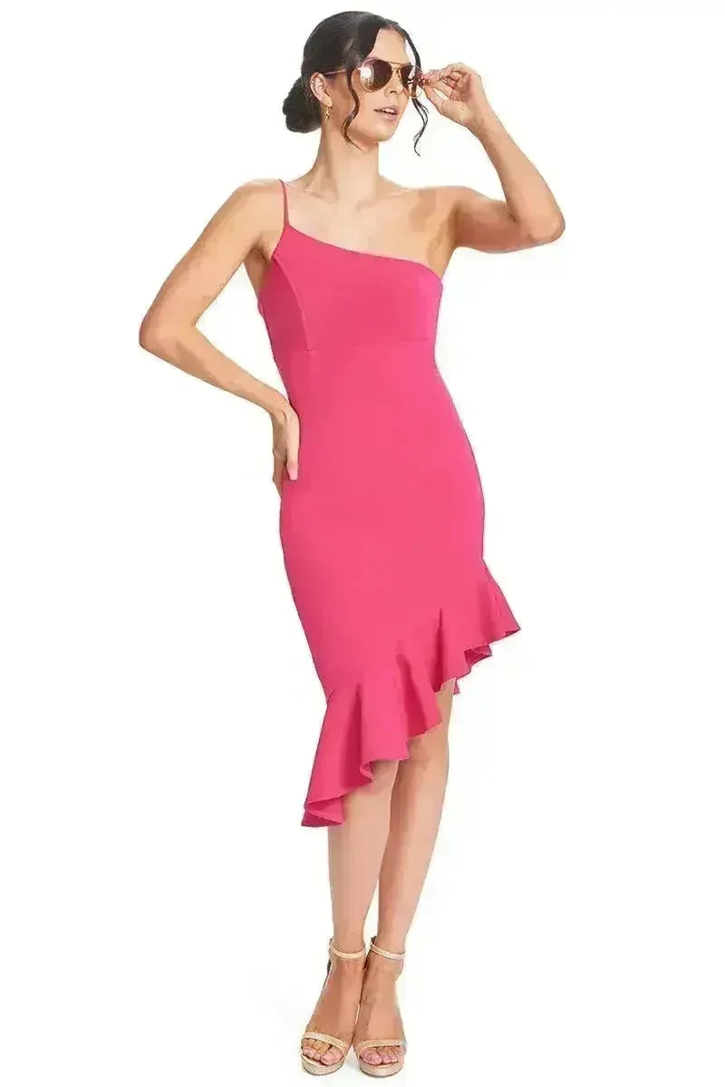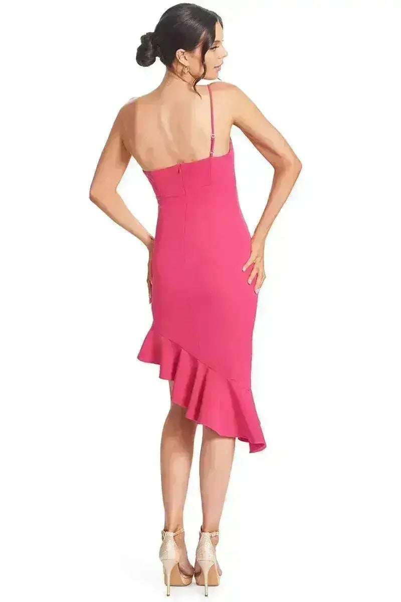 The Rufflin' Round Dress will bring out your fun, flirty, & girly side. Made in a fuchsia color, which is flattering on all skin tones, and will have others commenting, "pretty in pink," this dress can be worn during the day or evening. Featuring a single adjustable spaghetti strap, structured bodice with boning and bra cups, and an asymmetric ruffle hem. This dress will having you twirling all the way to your party. Pair it with gold or neutral heels and some gold, neck grazing chandelier earrings.