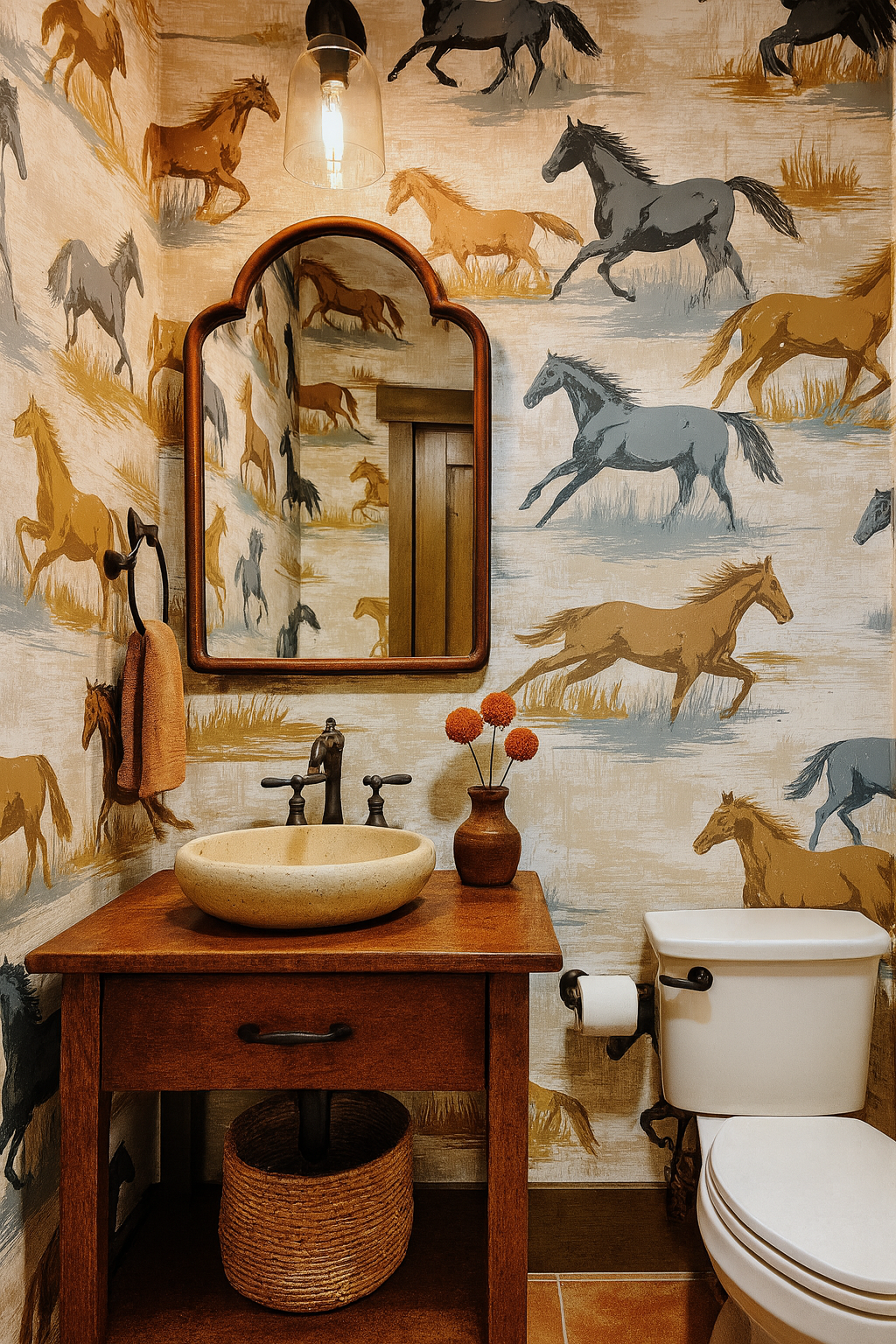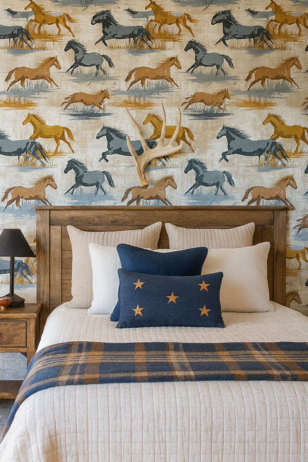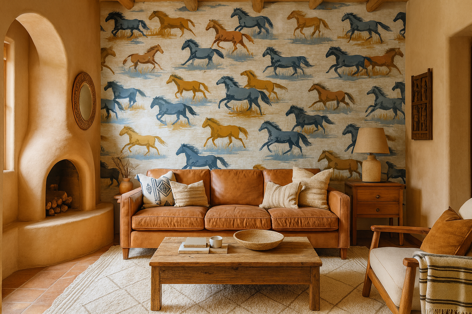 Bold silhouettes of wild mustangs charge across a neutral, brush-stroked terrain. Their energy is kinetic, expressive, and raw—captured in hues of ochre, rust, dusty blue, and charcoal. This pattern feels distinctly American West with a modern painterly edge. Ideal for rustic cabin walls, lodge bedding, or dramatic feature panels that celebrate motion and wildness.