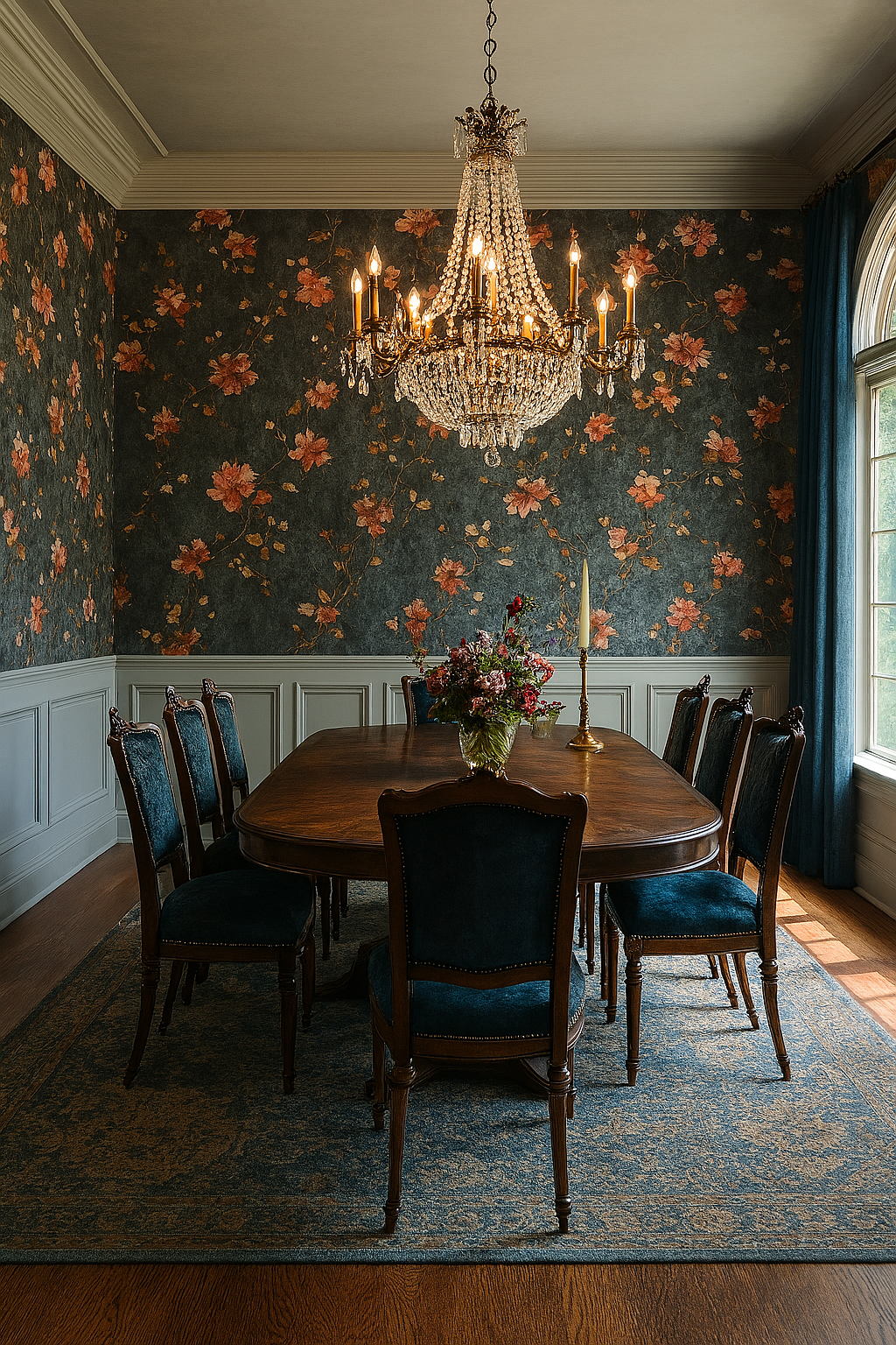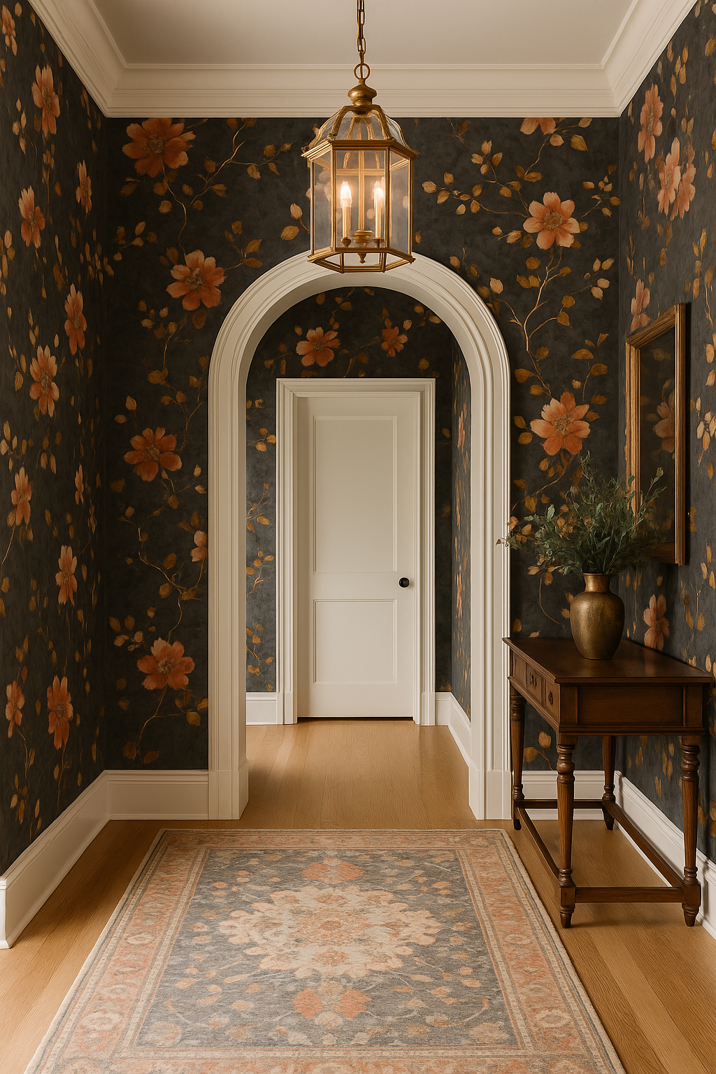 A painterly floral with grunge undertones, Rusted Bloom scatters warm coral-pink blossoms across a charcoal stone-textured background. The weathered aesthetic gives it a distinctly vintage-industrial feel—floral, yes, but not dainty. Use it in bold powder rooms, edgy lofts, or as a contrast to clean, modern furniture for a gritty-chic effect that commands attention.