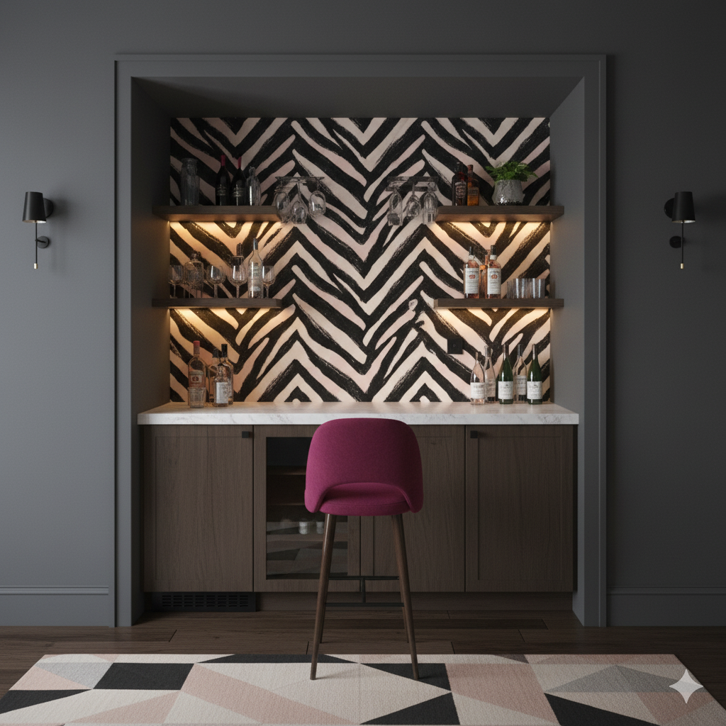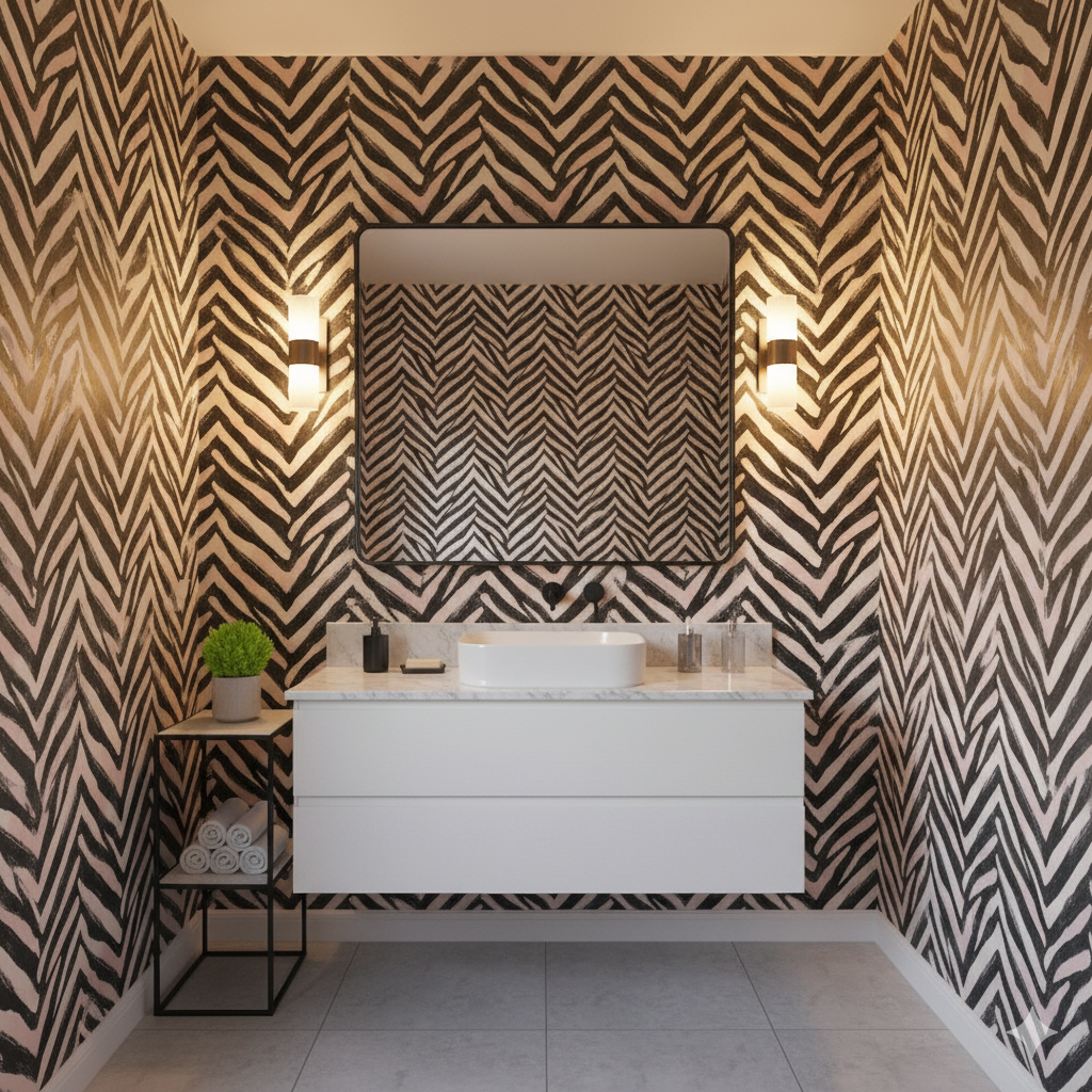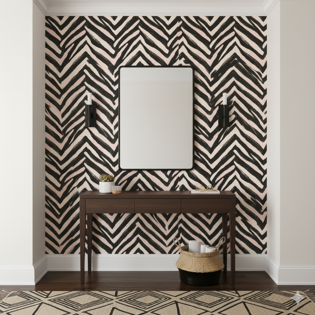 Here, wild energy is distilled into bold black strokes running diagonally like stylized zebra stripes, softened by a pale blush ground. The lines are raw and gestural, as if painted with a dry brush across a large canvas. The palette balances primal patterning with modern refinement, keeping the look fierce but not overwhelming. This wallpaper is ideal for statement spaces—powder rooms, fashion-forward studios, or bedrooms that demand personality. The combination of soft blush and inky black creates a tension between softness and strength, pairing seamlessly with rose gold fixtures, black lacquered accents, or pale minimalist furniture that allows the print to command attention.