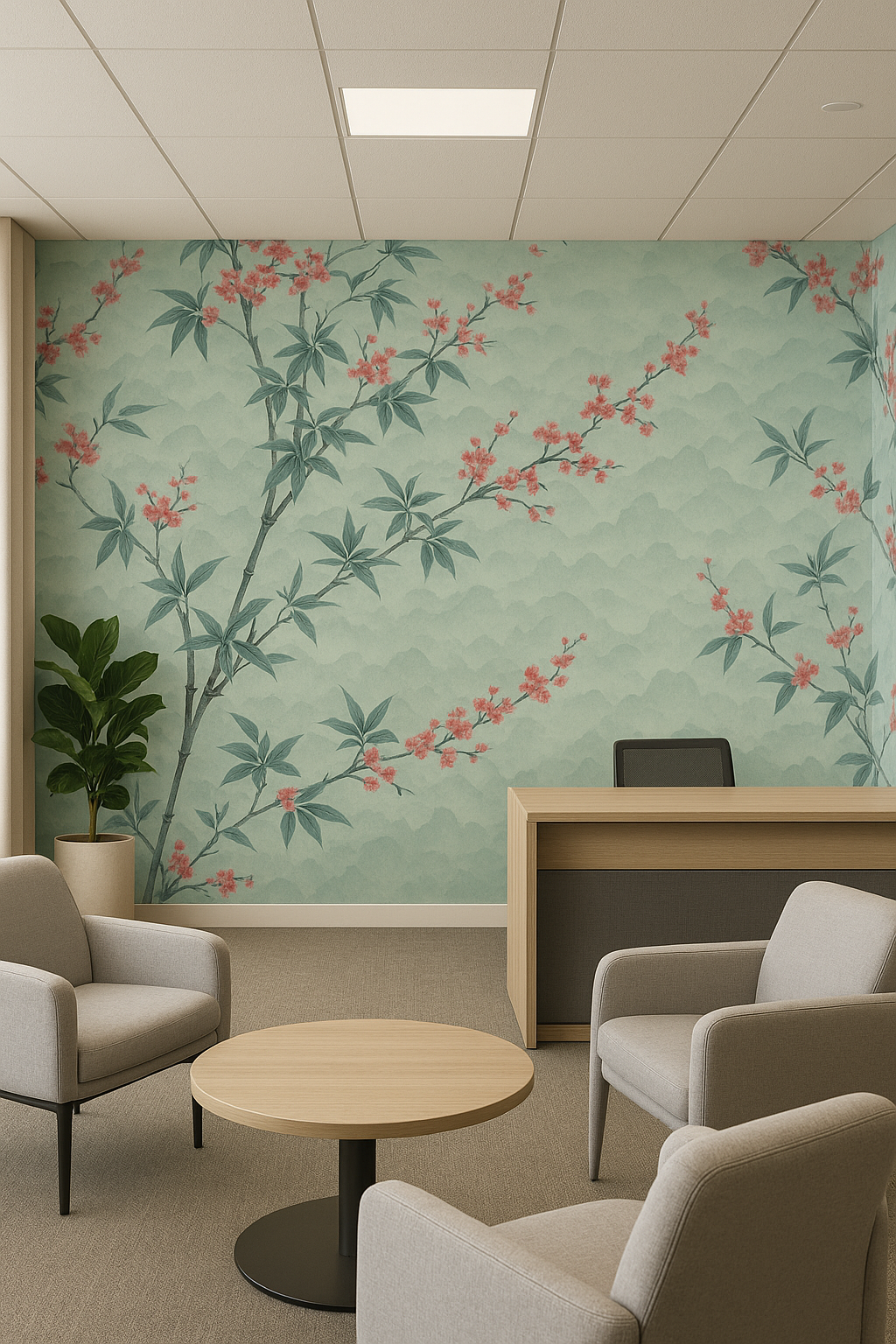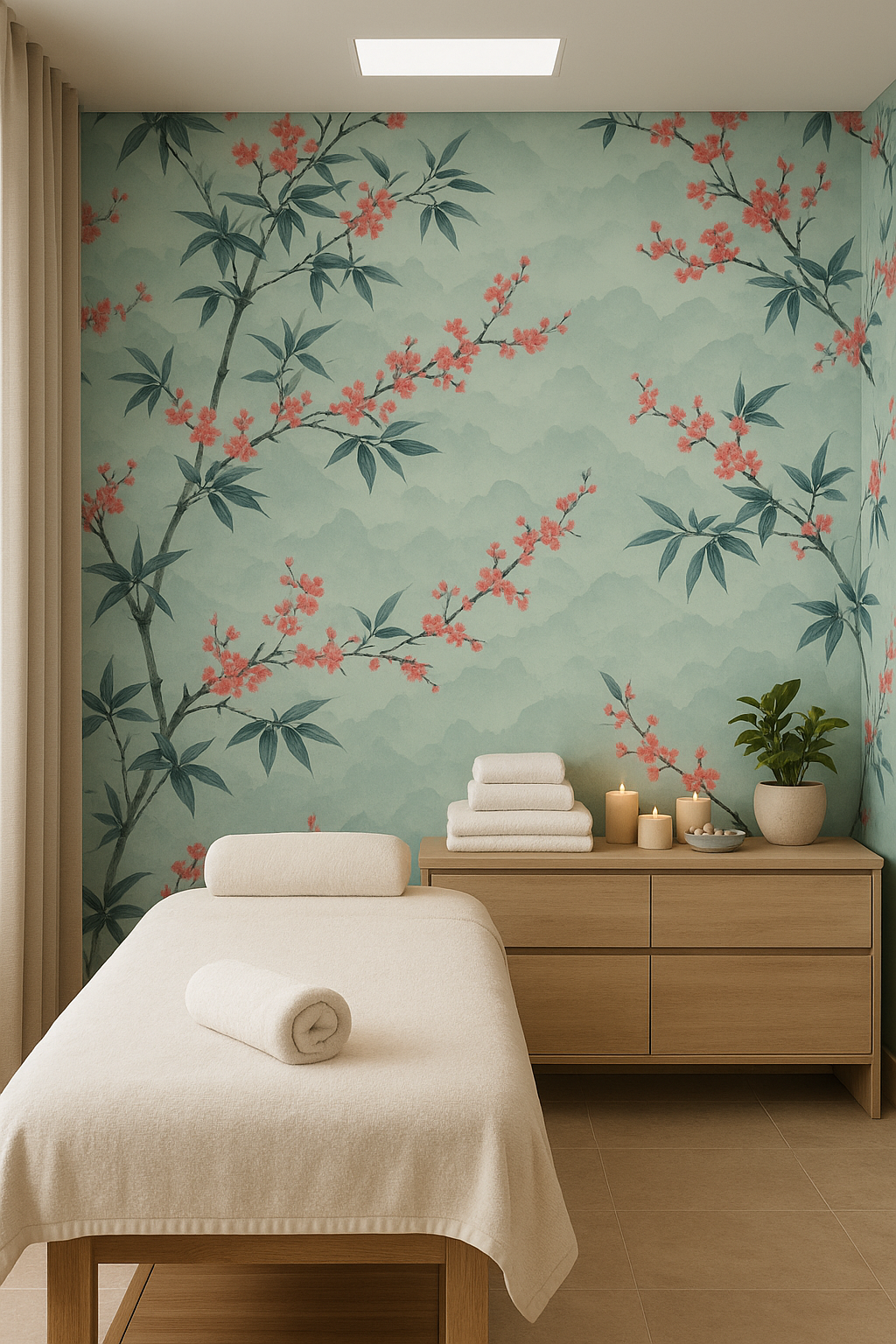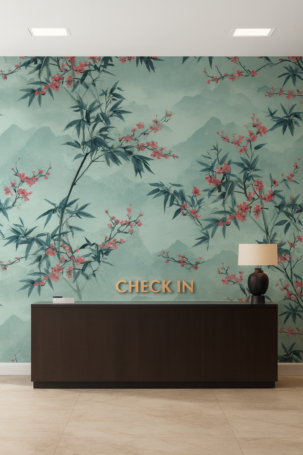 A delicate balance of East Asian elegance and artistic flow, "Sakura Mist" features inky bamboo stalks and coral-pink cherry blossoms stretching across a soft misty teal background. The layered watercolor mountain silhouettes add a dreamy depth to the design, making it perfect for serene spas, zen bedrooms, or artistic entryways. This Japanese-inspired wallpaper is graceful, refined, and rich in visual storytelling.