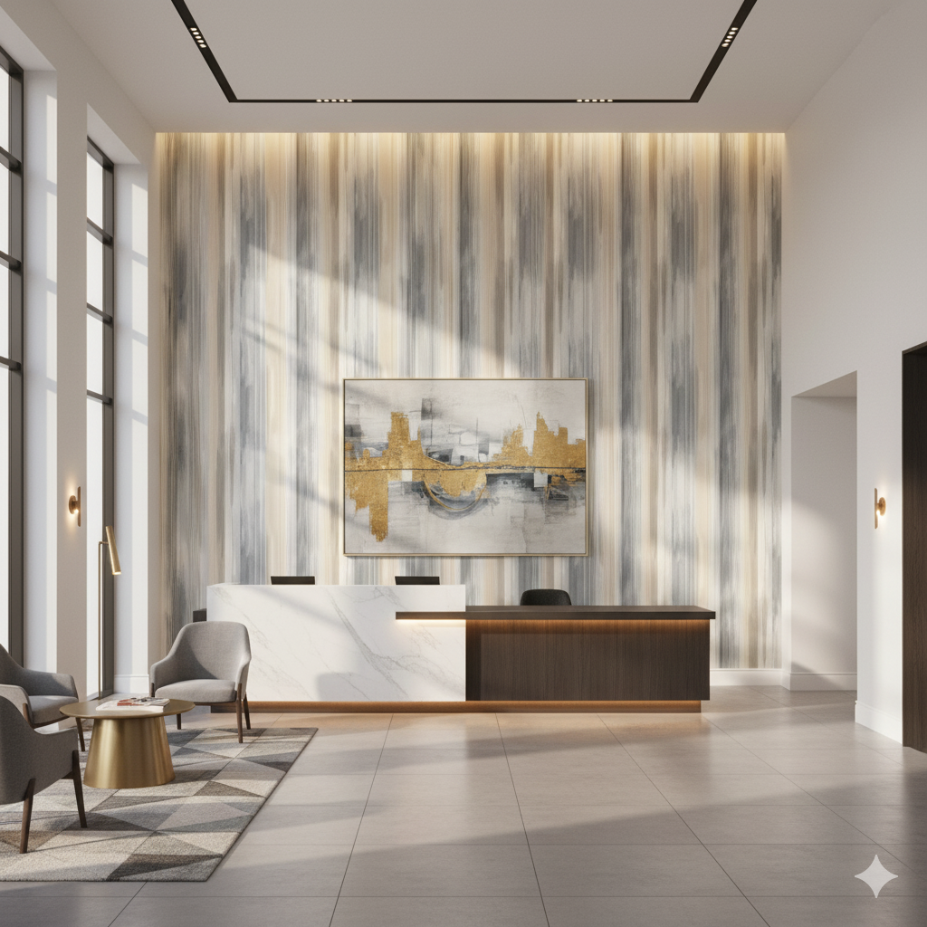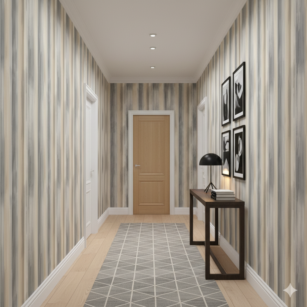 Vertical washes of beige, ivory, silver, and soft graphite flow together like sediment layers in stone or cascading rainfall. The painterly streaks create subtle depth and elongation, adding height and elegance to any space. This wallpaper is particularly effective in entryways, hallways, or contemporary bedrooms where vertical emphasis enhances architecture. It pairs beautifully with neutral furnishings and metallic accents, creating a sophisticated urban retreat.