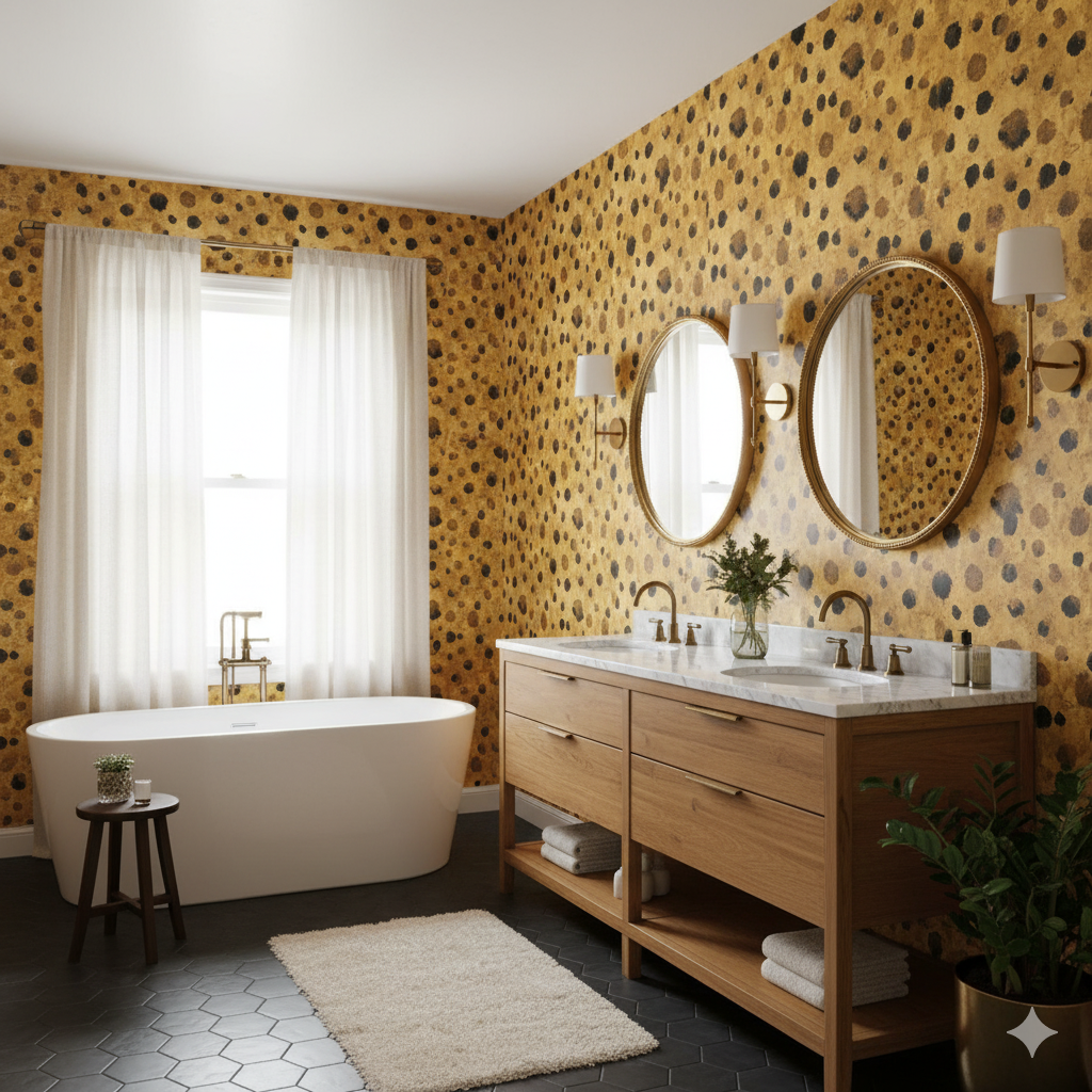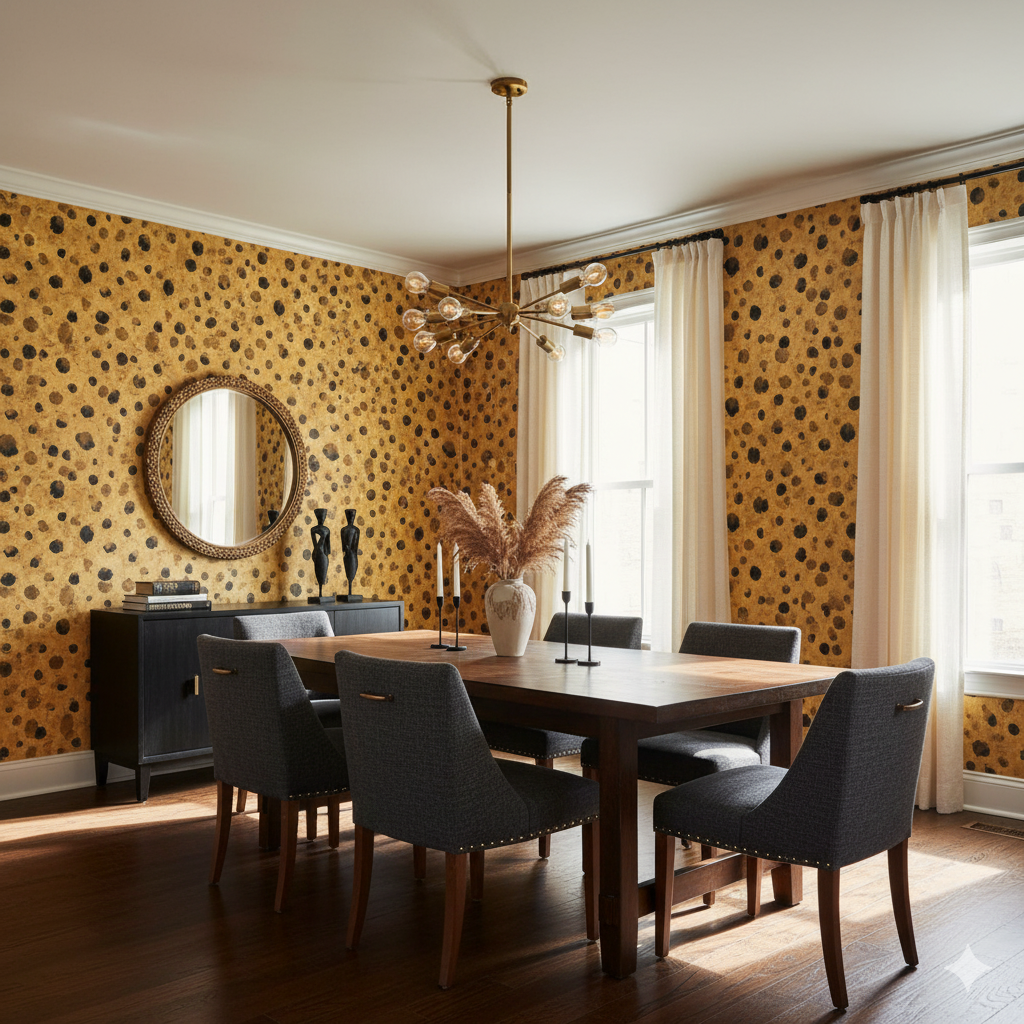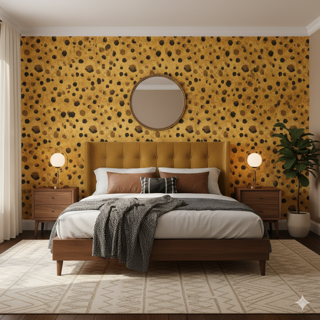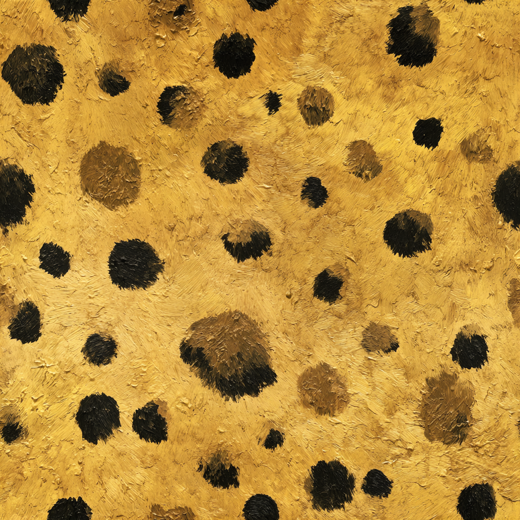 This pattern pulses with primal energy, reimagining the golden fur of a wild savanna predator. Broad strokes of ochre and caramel form the base, overlaid with irregular black rosettes that feel hand-painted and tactile. It’s a striking take on animal print, not polished or stylized, but rendered with expressive painterly depth. The effect is bold, commanding attention in eclectic interiors, fashion-forward boutiques, or statement powder rooms where drama is welcome. While undeniably exotic, the richness of the color palette ensures it can also work in masculine studies or maximalist lounges layered with leather and brass.