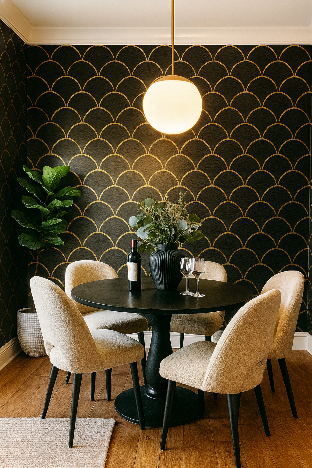 Scales of Fortune blends Japanese seigaiha waves and Art Deco shell forms in perfect symmetry. Gleaming gold arcs layer over a velvety black base, forming a rhythmic, fish-scale structure that shimmers with quiet luxury. Ideal for stairwells, entryways, or any space begging for drama and balance, this pattern delivers timeless glamour with a touch of myth.