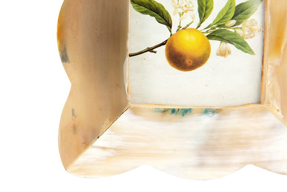 Shades of brown, beige and amber are seen in this resin photo frame with scalloped edges. It has a distressed finish adding to the stripes and swirls displayed within the surface. Place this unique picture frame on a shelf or tabletop in the home or office. Holds a 3"x3" photo.