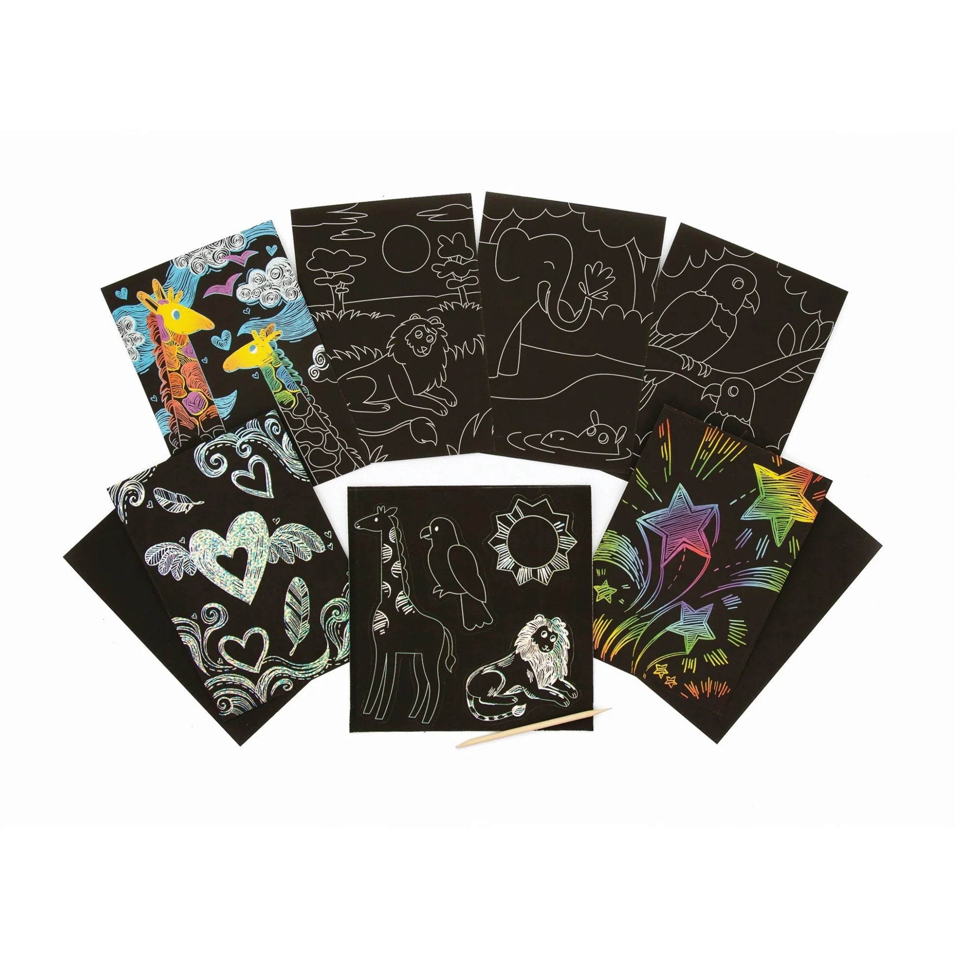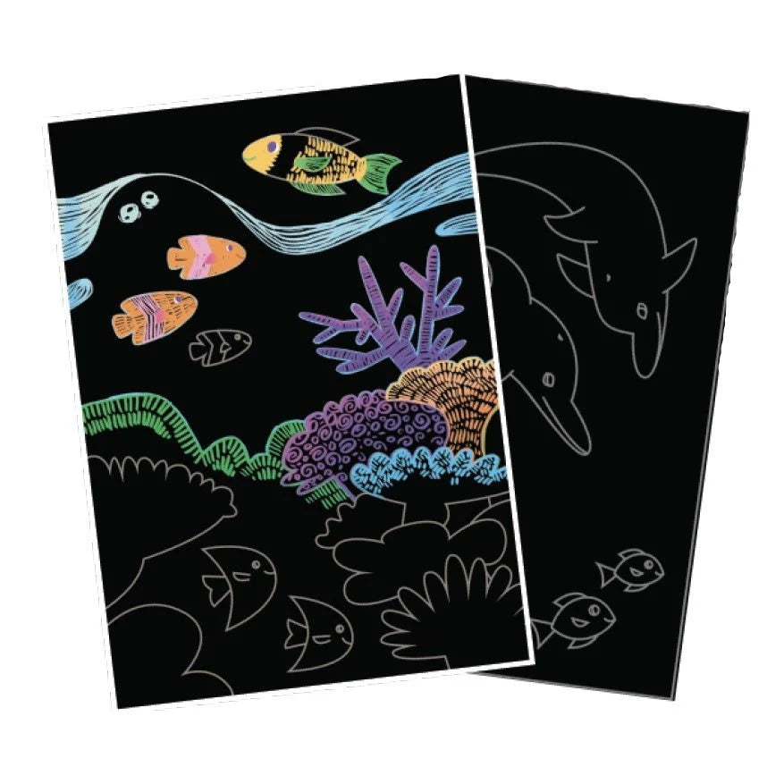 Ocean Lifescratch card kit|Kit includes: 4 illustrated scratch cards (5.8 x 8.3 inches), 2 rainbow and 2 sparkled blank scratch cards (5.8 x 8.3 inches), 1 sparkled sticker sheet (7.8 x 7.8 inches), and 1 wooden scratching tool|Guided illustrations are easy for kids to follow|Add your own patterns and designs to create a unique work of art|Everything that you need is included, along with instructions to get you started. See how it works: wholesale.ooly.com/scratch-scribble.