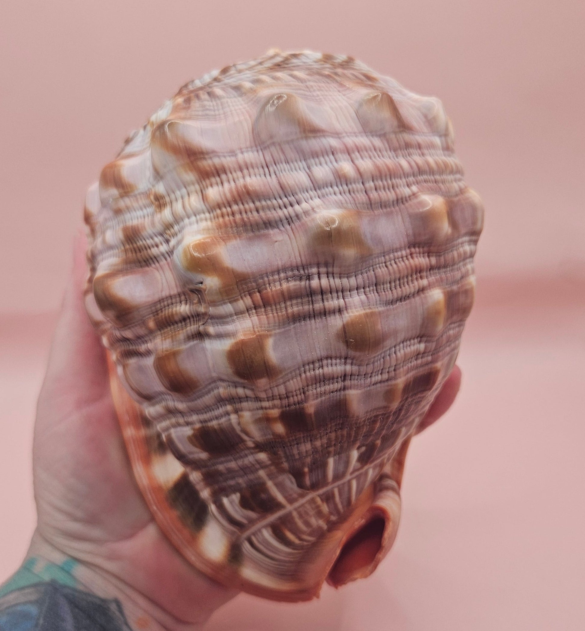 Bring the bold and beautiful textures of the sea to your home with this eye-catching bullmouth Cameo helmet shell. With its glossy peach-toned opening and intricately ridged back in rich chocolate, ivory, and slate tones, this shell creates a stunning coastal accent on any shelf or tabletop. Its unique shape and smooth finish make it perfect for display in natural light or as part of a curated ocean-inspired collection.